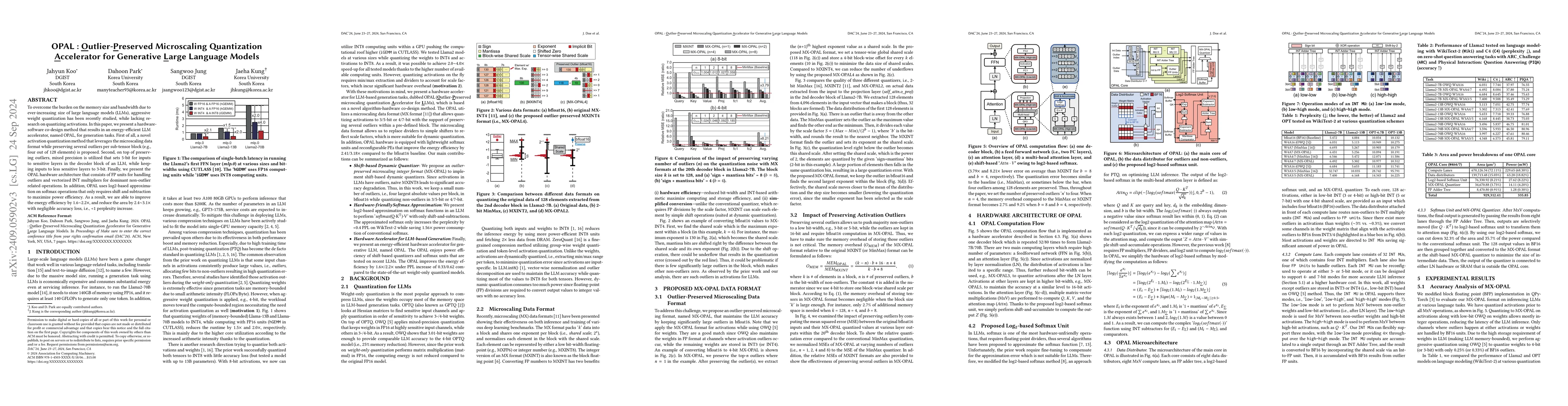OPAL introduces an energy-efficient accelerator for generative large language models through a novel activation quantization method preserving outliers and mixed precision. The architecture uses FP units for outliers and vectorized INT multipliers for main operations, achieving up to 2.2x energy efficiency improvement and 3.1x area reduction with minimal accuracy loss.