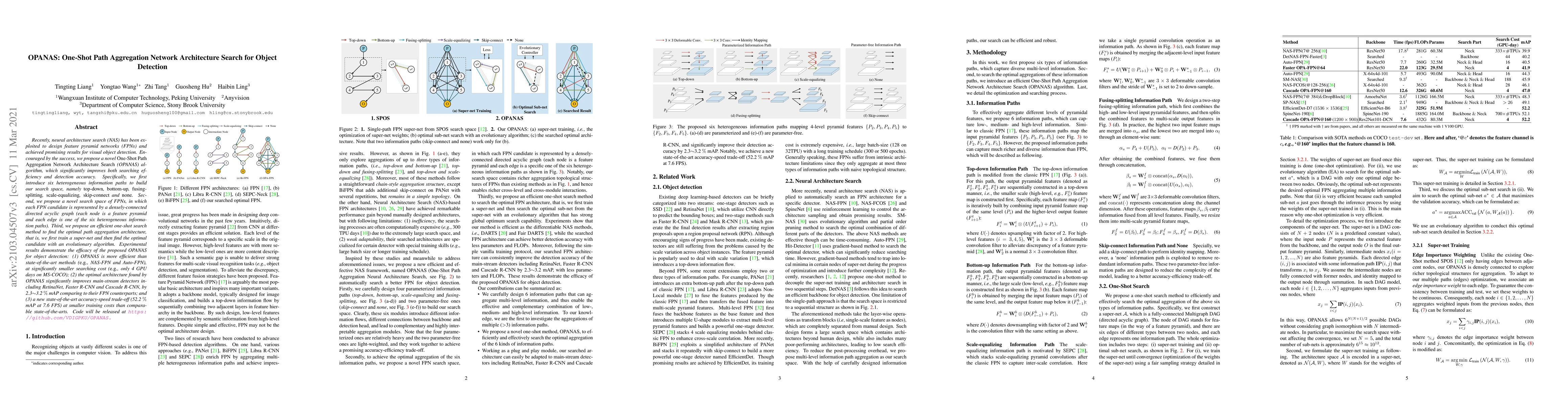 The OPANAS algorithm introduces a novel one-shot search method for efficiently discovering optimal path aggregation architectures in feature pyramid networks (FPNs) for object detection, significantly improving both search efficiency and detection accuracy compared to state-of-the-art methods. The approach achieves a new state-of-the-art accuracy-speed trade-off with a 52.2% mAP at 7.6 FPS.