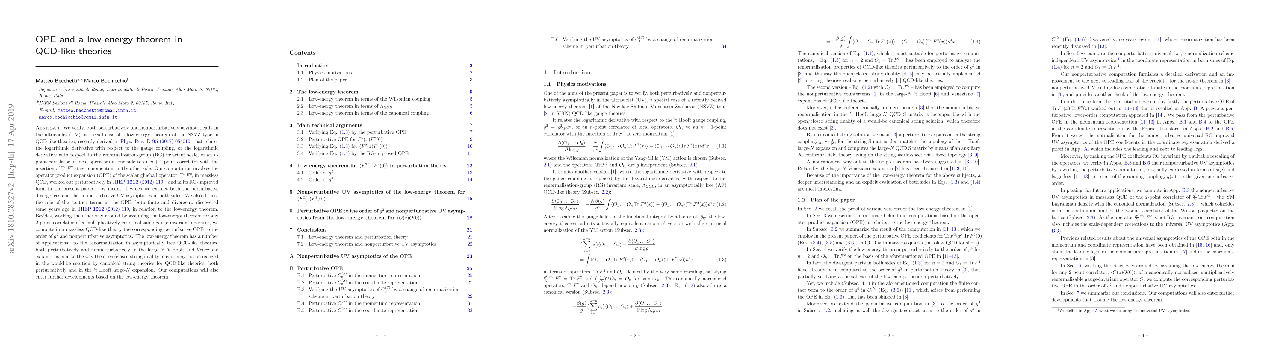 We verify, both perturbatively and nonperturbatively asymptotically in the ultraviolet (UV), a special case of a low-energy theorem of the NSVZ type in QCD-like theories, recently derived in arXiv:1701.07833, that relates the logarithmic derivative with respect to the gauge coupling, or the logarithmic derivative with respect to the renormalization-group (RG) invariant scale, of an $n$-point correlator of local operators in one side to an $n+1$-point correlator with the insertion of $Tr F^2$ at zero momentum in the other side. Our computation involves the operator product expansion (OPE) of the scalar glueball operator, $Tr F^2$, in massless QCD, worked out perturbatively in arXiv:1209.1516 -- and in its RG-improved form in the present paper -- by means of which we extract both the perturbative divergences and the nonperturbative UV asymptotics in both sides. We also discuss the role of the contact terms in the OPE, both finite and divergent, discovered some years ago in arXiv:1209.1516, in relation to the low-energy theorem. Besides, working the other way around by assuming the low-energy theorem for any 2-point correlator of a multiplicatively renormalizable gauge-invariant operator, we compute in a massless QCD-like theory the corresponding perturbative OPE to the order of $g^2$ and nonperturbative asymptotics. The low-energy theorem has a number of applications: to the renormalization in asymptotically free QCD-like theories, both perturbatively and nonperturbatively in the large-$N$ 't Hooft and Veneziano expansions, and to the way the open/closed string duality may or may not be realized in the would-be solution by canonical string theories for QCD-like theories, both perturbatively and in the 't Hooft large-$N$ expansion. Our computations will also enter further developments based on the low-energy theorem.