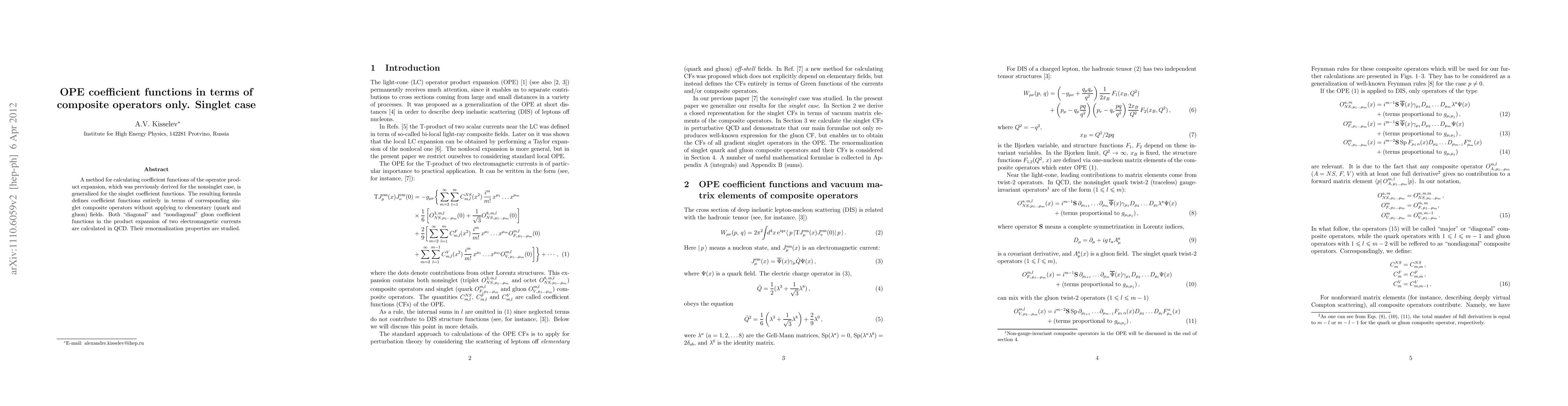 A method for calculating coefficient functions of the operator product expansion, which was previously derived for the non-singlet case, is generalized for the singlet coefficient functions. The resulting formula defines coefficient functions entirely in terms of corresponding singlet composite operators without applying to elementary (quark and gluon) fields. Both "diagonal" and "non-diagonal" gluon coefficient functions in the product expansion of two electromagnetic currents are calculated in QCD. Their renormalization properties are studied.