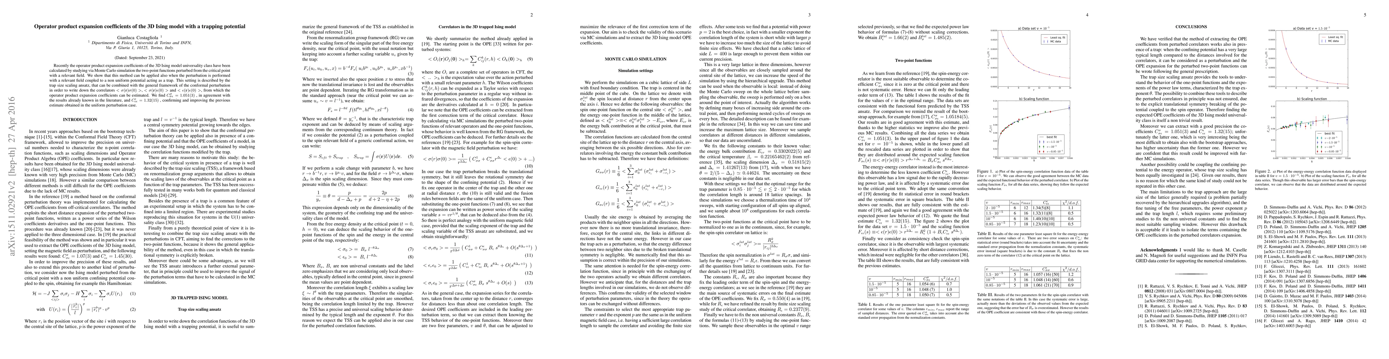 Recently the OPE coefficients of the 3D Ising model universality class have been calculated by studying the two-point functions perturbed from the critical point with a relevant field. We show that this method can be applied also when the perturbation is performed with a relevant field coupled to a non uniform potential acting as a trap. This setting is described by the trap size scaling ansatz, that can be combined with the general framework of the conformal perturbation in order to write down the correlators $<\sigma (\mathbf {r})\sigma(0)>$, $<\sigma (\mathbf{r})\epsilon(0)>$ and $<\epsilon (\mathbf {r})\epsilon(0)>$, from which the OPE coefficients can be estimated. We find $C^{\sigma}_{\sigma\epsilon}= 1.051(3)$ , in agreement with the results already known in the literature, and $C^{\epsilon}_{\epsilon\epsilon}= 1.32 (15)$ , confirming and improving the previous estimate obtained in the uniform perturbation case.