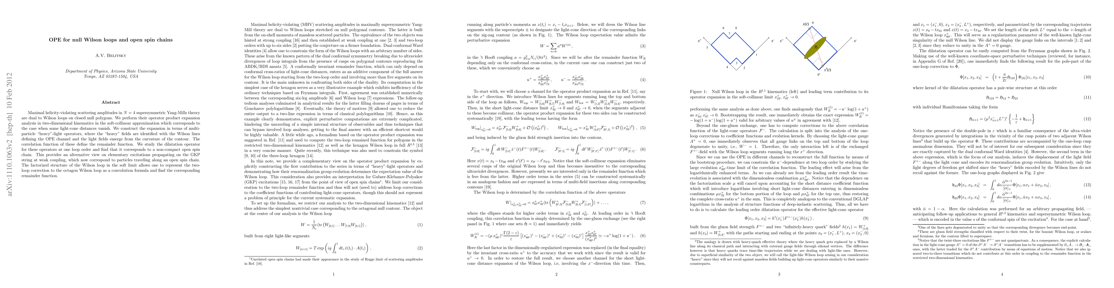 This paper analyzes the operator product expansion (OPE) for null Wilson loops in N=4 supersymmetric Yang-Mills theory, revealing a connection to multi-particle "heavy"-light operators. It finds that the dilatation operator at one loop corresponds to a non-compact open spin chain, providing an alternative view of elementary excitations on the GKP string.