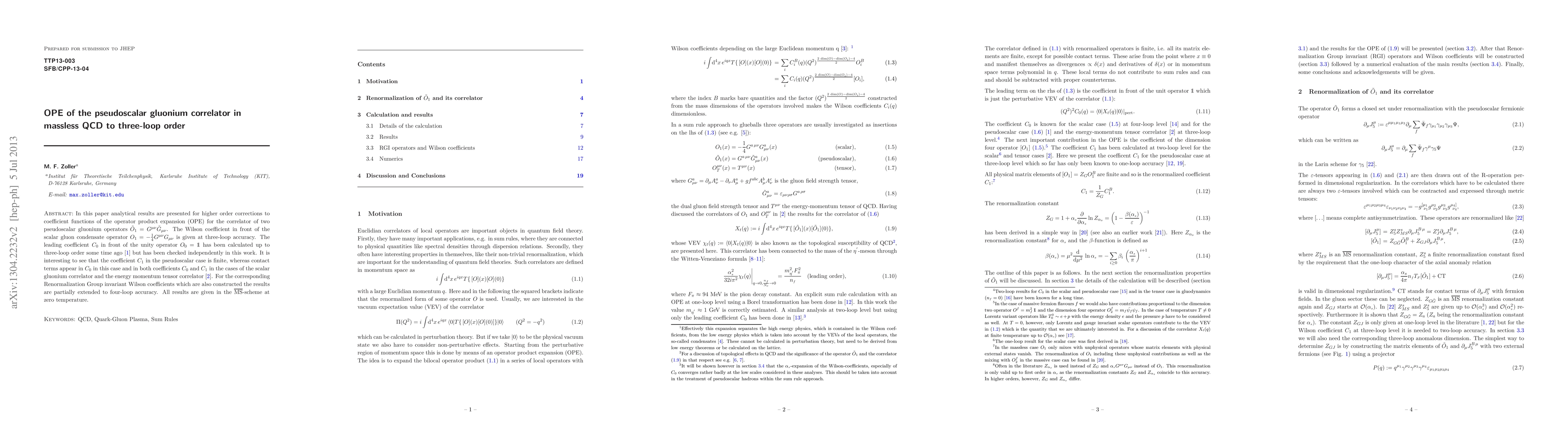 This paper provides analytical results for three-loop corrections to the operator product expansion (OPE) coefficients for the correlator of pseudoscalar gluonium operators, focusing on the Wilson coefficient for the scalar gluon condensate. It confirms the finiteness of the pseudoscalar coefficient and extends renormalization group invariant Wilson coefficients to four-loop accuracy in the MSbar scheme.