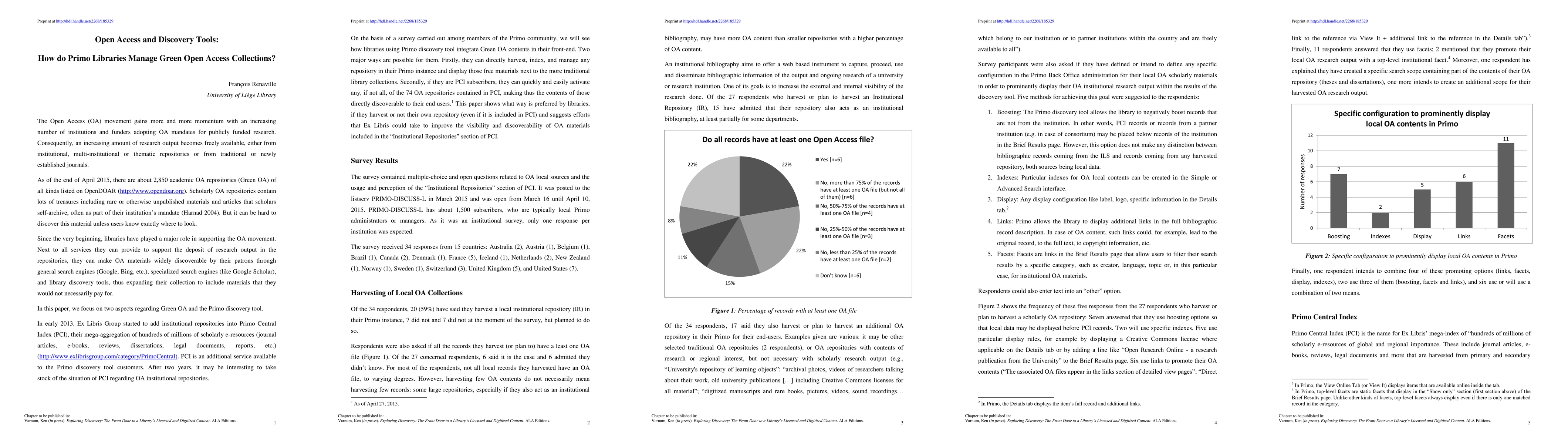 This paper examines how Primo libraries manage and integrate Green Open Access collections into their discovery tools. It highlights two methods: direct repository management within Primo and the use of Primo Central Index to easily discover Open Access materials, based on a survey conducted within the Primo community.