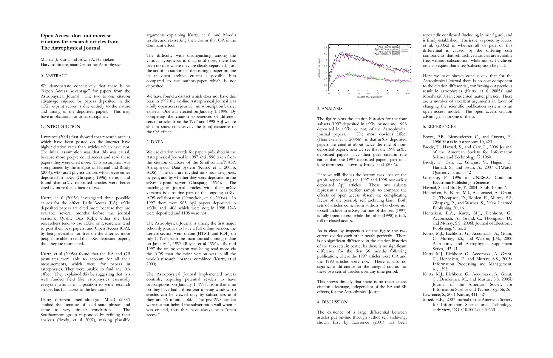 Summary: Research shows no increase in citations for open access articles from The Astrophysical Journal, suggesting the cited advantage seen in arXiv papers is due to their nature and timing rather than open access. This finding may have broader implications for other fields.