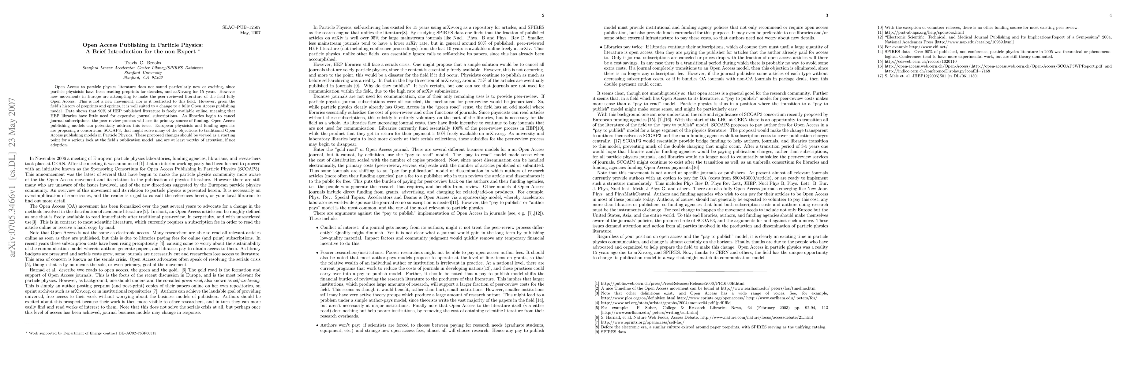 This paper introduces the concept of Open Access publishing in particle physics, noting that while preprints have long been common, new initiatives aim to make peer-reviewed literature fully accessible. The proposed changes, including the SCOAP3 consortium, could address funding issues for the peer review process as libraries cancel subscriptions.