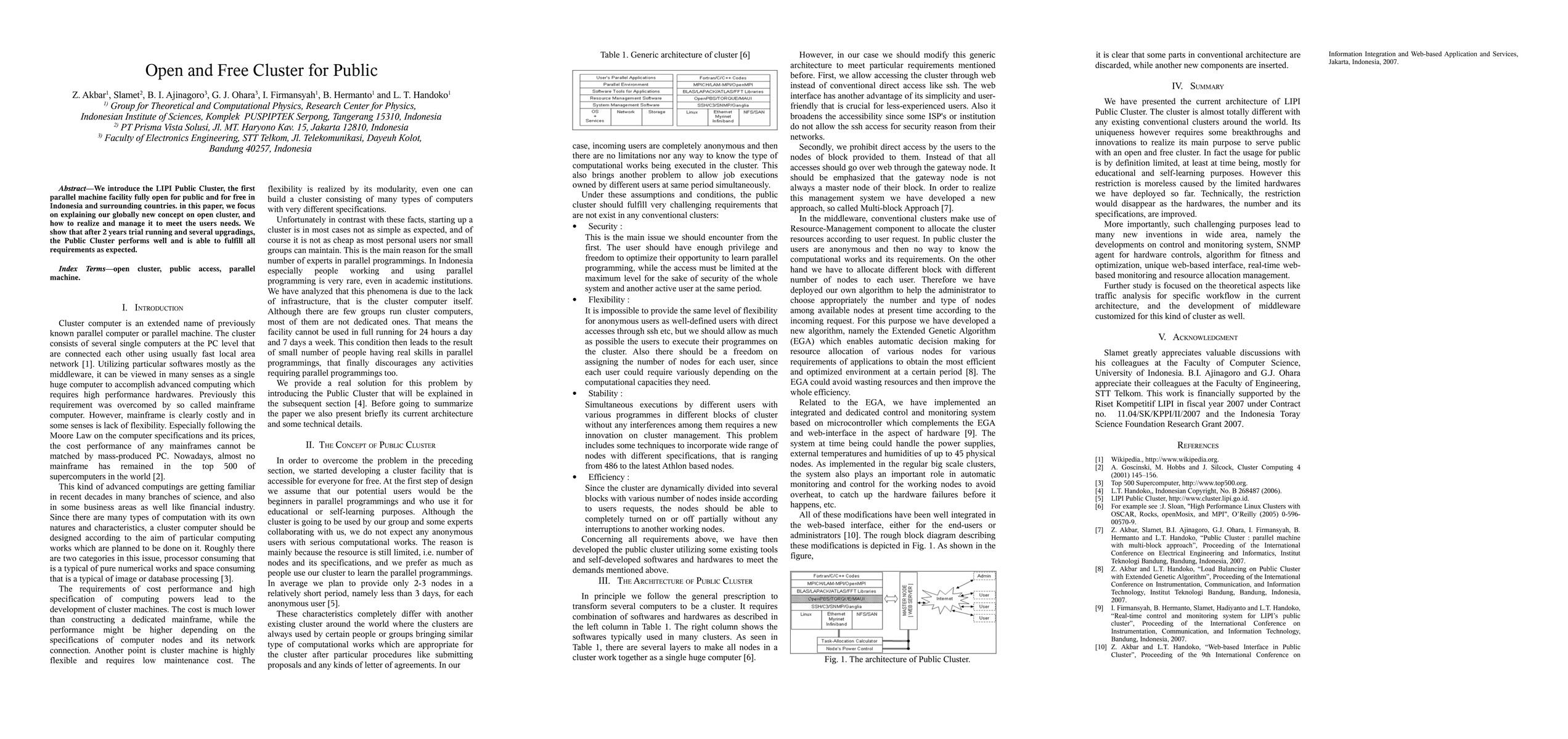The LIPI Public Cluster is the first fully open and free parallel computing facility in Indonesia and surrounding regions. After two years of operation and upgrades, the cluster successfully meets user needs and performs well.