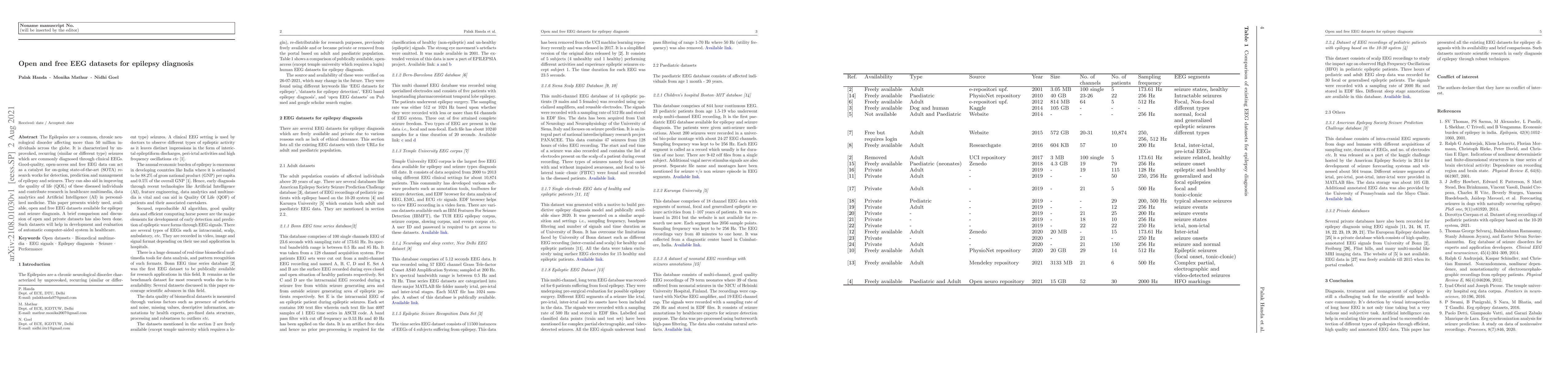 The Epilepsies are a common, chronic neurological disorder affecting more than 50 million individuals across the globe. It is characterized by unprovoked, recurring (similar or different type) seizures which are commonly diagnosed through clinical EEGs. Good-quality, open-access and free EEG data can act as a catalyst for on-going state-of-the-art (SOTA) research works for detection, prediction and management of epilepsy and seizures. They can also aid in improving the quality of life (QOL) of these diseased individuals and contribute research in healthcare multimedia, data analytics and Artificial Intelligence (AI) in personalized medicine. This paper presents widely used, available, open and free EEG datasets available for epilepsy and seizure diagnosis. A brief comparison and discussion of open and private datasets has also been done. Such datasets will help in development and evaluation of automatic computer-aided system in healthcare.
