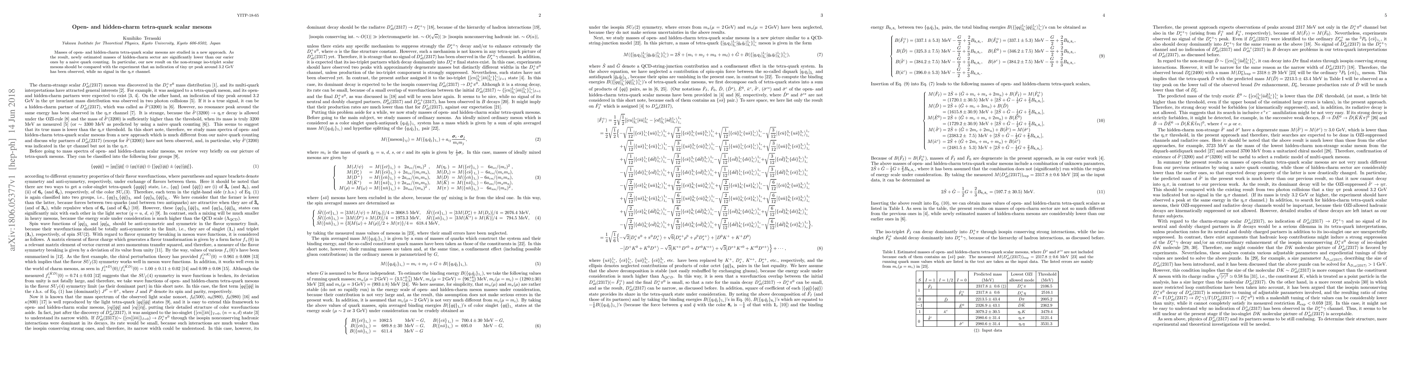 Masses of open- and hidden-charm tetra-quark scalar mesons are studied in a new approach. As the result, newly estimated masses of hidden-charm sector are significantly lower than our earier ones by a naive quark counting. In particular, our new result on the non-strange iso-triplet scalar mesons should be compared with the experiment that an indication of tiny eta pi peak around 3.2 GeV has been observed, while no signal in the eta_c pi channel.