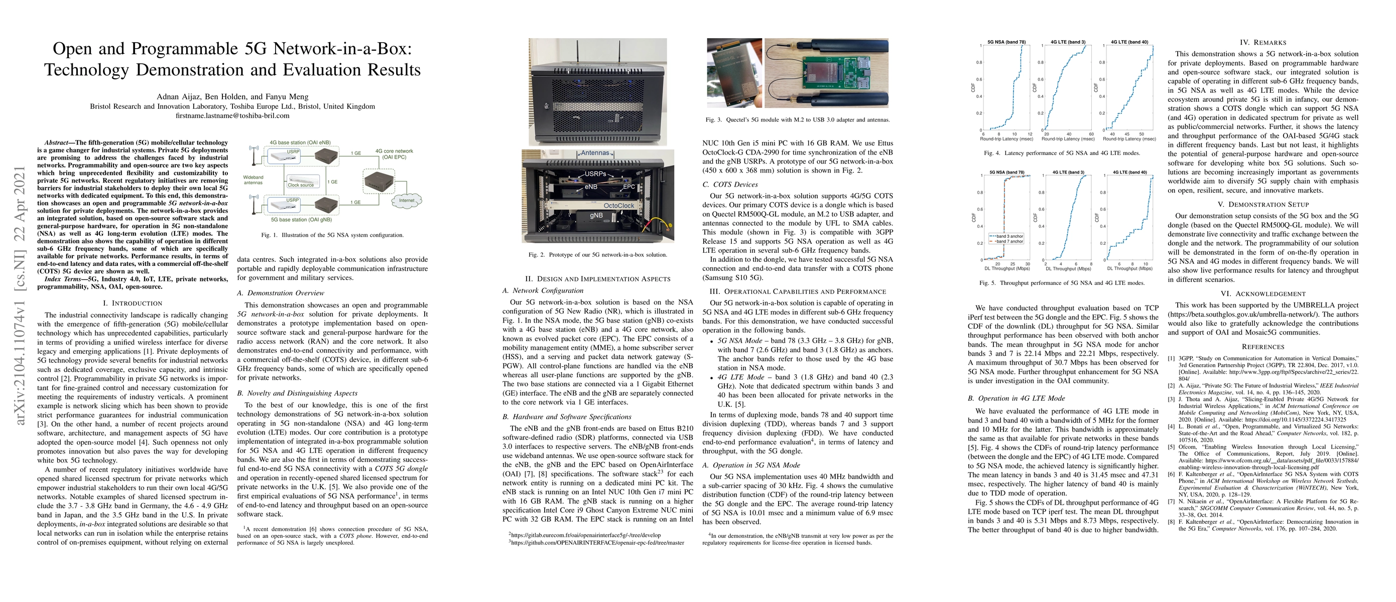A 5G network-in-a-box solution showcasing open and programmable technology for private deployments has been demonstrated, offering flexibility and customizability for industrial networks. The solution achieved promising performance results in terms of latency and data rates using a commercial off-the-shelf 5G device.