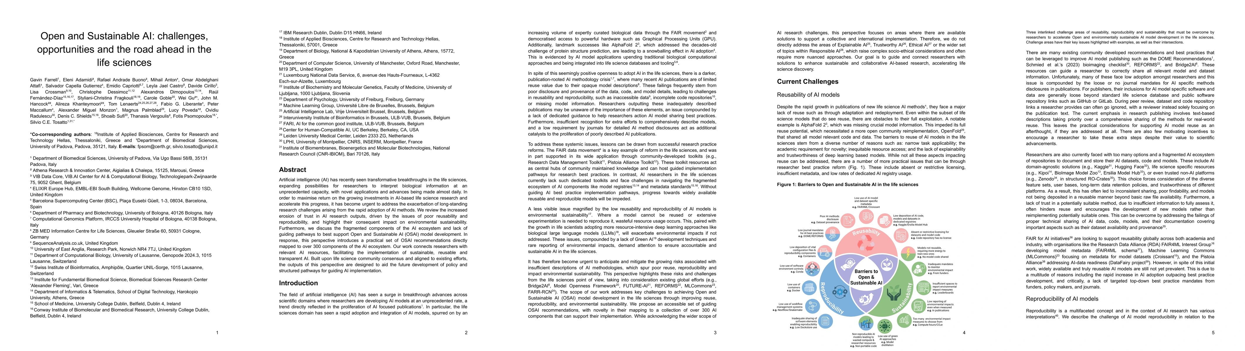 The paper reviews existing AI methods in life sciences, identifies challenges related to trust, reusability, reproducibility, and sustainability, and proposes a set of OSAI (Open and Sustainable AI) recommendations.