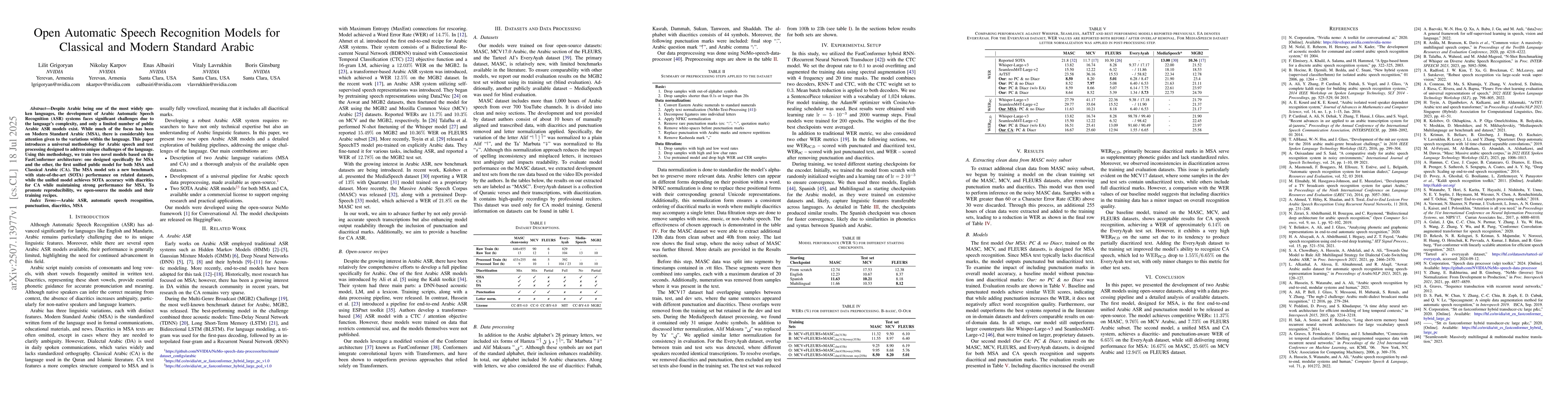 Despite Arabic being one of the most widely spoken languages, the development of Arabic Automatic Speech Recognition (ASR) systems faces significant challenges due to the language's complexity, and only a limited number of public Arabic ASR models exist. While much of the focus has been on Modern Standard Arabic (MSA), there is considerably less attention given to the variations within the language. This paper introduces a universal methodology for Arabic speech and text processing designed to address unique challenges of the language. Using this methodology, we train two novel models based on the FastConformer architecture: one designed specifically for MSA and the other, the first unified public model for both MSA and Classical Arabic (CA). The MSA model sets a new benchmark with state-of-the-art (SOTA) performance on related datasets, while the unified model achieves SOTA accuracy with diacritics for CA while maintaining strong performance for MSA. To promote reproducibility, we open-source the models and their training recipes.