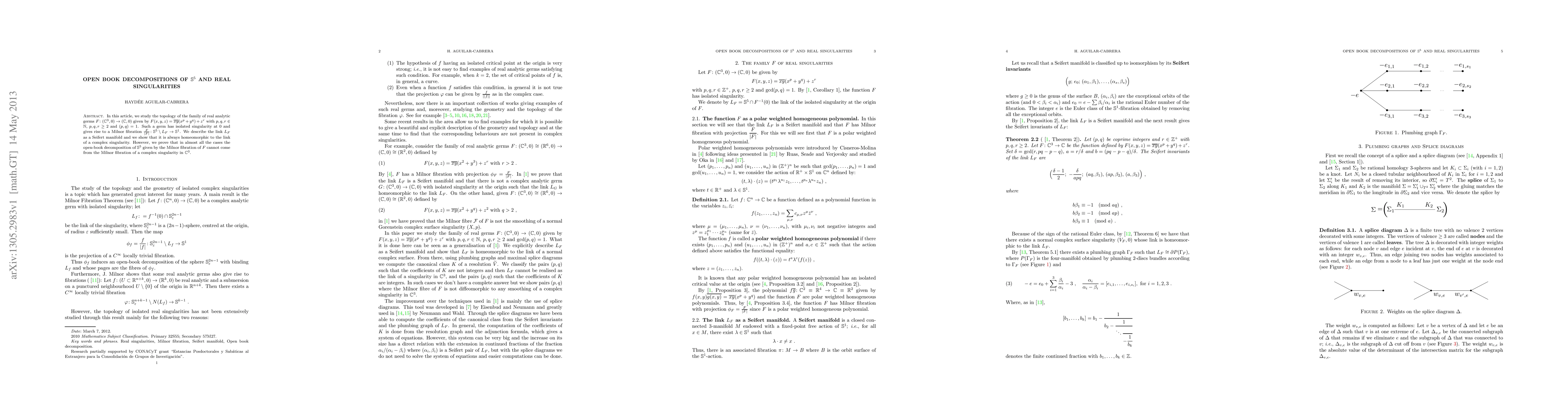 In this article, we study the topology of the family of real analytic germs $F \colon (\mathbb{C}^3,0) \to (\mathbb{C},0)$ given by $F(x,y,z)=\bar{xy}(x^p+y^q)+z^r$ with $p,q,r \in \mathbb{N}$, $p,q,r \geq 2$ and $(p,q)=1$. Such a germ has isolated singularity at 0 and gives rise to a Milnor fibration $\frac{F}{|F|} \colon \mathbb{S}^{5} \setminus L_F \to \mathbb{S}^{1}$. We describe the link $L_F$ as a Seifert manifold and we show that it is always homeomorphic to the link of a complex singularity. However, we prove that in almost all the cases the open-book decomposition of $\mathbb{S}^{5}$ given by the Milnor fibration of $F$ cannot come from the Milnor fibration of a complex singularity in $\mathbb{C}^3$.