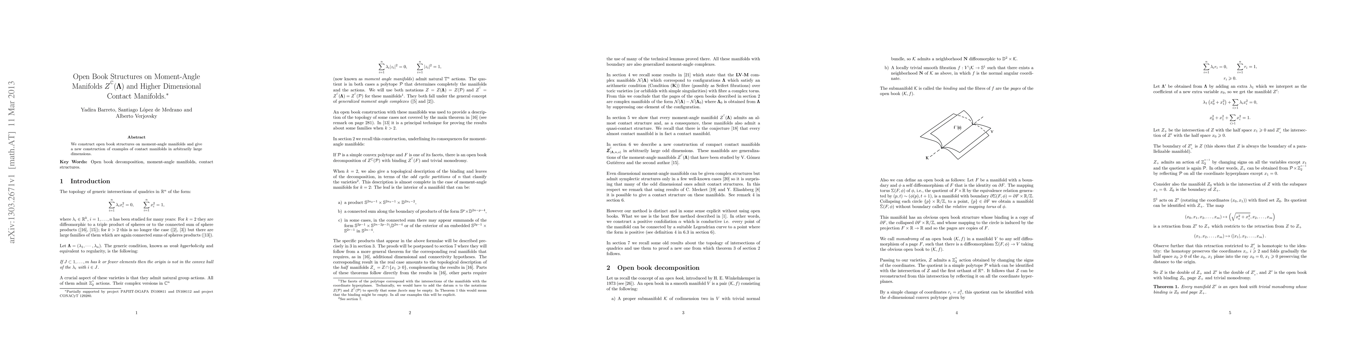 Summary: The paper constructs open book structures on moment-angle manifolds, providing a novel approach to defining higher-dimensional contact manifolds in any dimension.