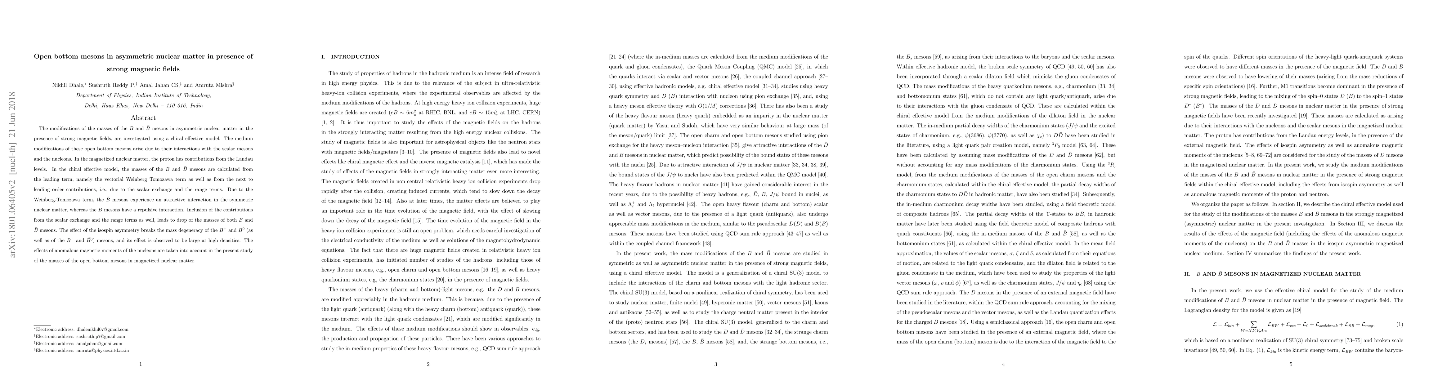 The modifications of the masses of the $B$ and $\bar B$ mesons in asymmetric nuclear matter in the presence of strong magnetic fields, are investigated using a chiral effective model. The medium modifications of these open bottom mesons arise due to their interactions with the scalar mesons and the nucleons. In the magnetized nuclear matter, the proton has contributions from the Landau levels. In the chiral effective model, the masses of the $B$ and $\bar B$ are calculated from the leading term, namely the vectorial Weinberg Tomozawa term as well as from the next to leading order contributions, i.e., due to the scalar exchange and the range terms. Due to the Weinberg-Tomozawa term, the $\bar B$ mesons experience an attractive interaction in the symmetric nuclear matter, whereas the $B$ mesons have a repulsive interaction. Inclusion of the contributions from the scalar exchange and the range terms as well, leads to drop of the masses of both $B$ and $\bar B$ mesons. The effect of the isospin asymmetry breaks the mass degeneracy of the $B^+$ and $B^0$ (as well as of the $B^-$ and $\bar {B^0}$) mesons, and its effect is observed to be large at high densities. The effects of anomalous magnetic moments of the nucleons are taken into account in the present study of the masses of the open bottom mesons in magnetized nuclear matter.