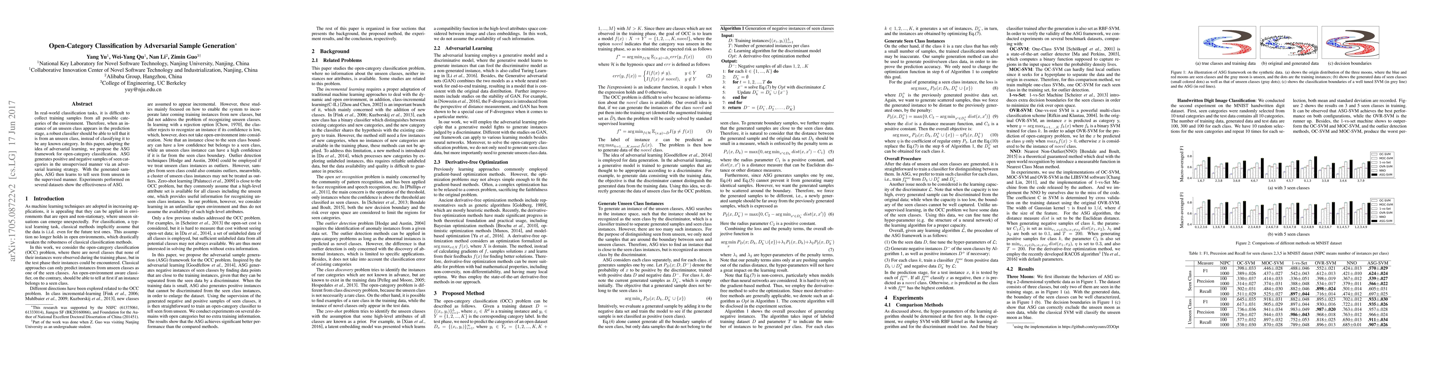 In real-world classification tasks, it is difficult to collect training samples from all possible categories of the environment. Therefore, when an instance of an unseen class appears in the prediction stage, a robust classifier should be able to tell that it is from an unseen class, instead of classifying it to be any known category. In this paper, adopting the idea of adversarial learning, we propose the ASG framework for open-category classification. ASG generates positive and negative samples of seen categories in the unsupervised manner via an adversarial learning strategy. With the generated samples, ASG then learns to tell seen from unseen in the supervised manner. Experiments performed on several datasets show the effectiveness of ASG.