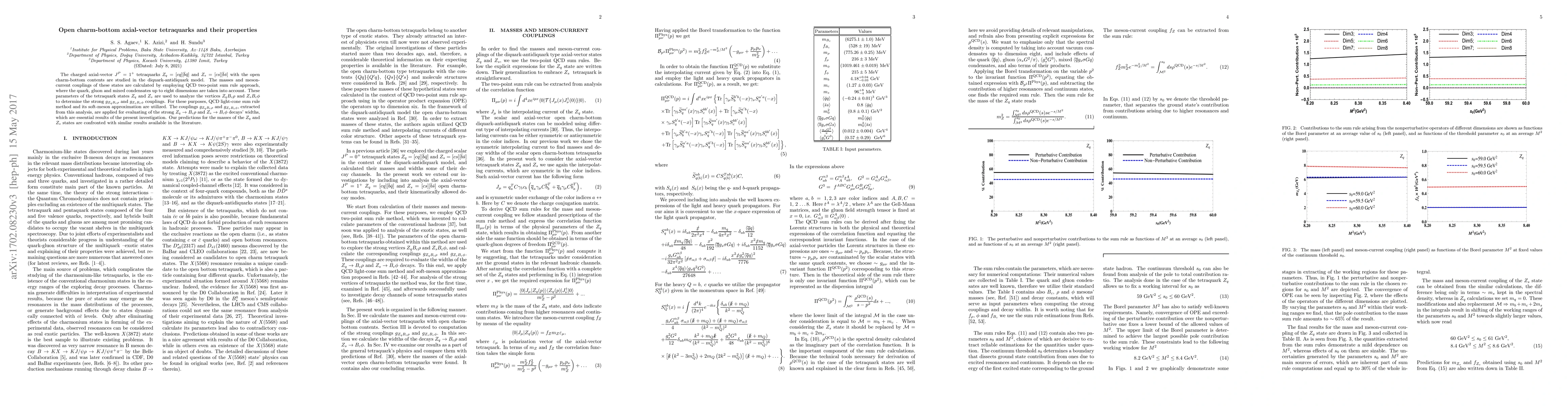 The charged axial-vector $J^{P}=1^{+}$ tetraquarks $Z_{q}=[cq][\bar {b} \bar q ]$ and $Z_{s}=[cs][\bar {b} \bar s]$ with the open charm-bottom contents are studied in the diquark-antidiquark model. The masses and meson-current couplings of these states are calculated by employing QCD two-point sum rule approach, where the quark, gluon and mixed condensates up to eight dimensions are taken into account. These parameters of the tetraquark states $ Z_{q}$ and $Z_{s}$ are used to analyze the vertices $Z_q B_c \rho $ and $Z_s B_c \phi $ to determine the strong $g_{Z_qB_c \rho }$ and $g_{Z_sB_c \phi }$ couplings. For these purposes, QCD light-cone sum rule method and its soft-meson approximation are utilized. The couplings $g_{Z_qB_c \rho }$ and $ g_{Z_sB_c \phi }$, extracted from this analysis, are applied for evaluating of the strong $Z_q \to B_c \rho$ and $Z_s \to B_c \phi$ decays' widths, which are essential results of the present investigation. Our predictions for the masses of the $Z_{q}$ and $Z_{s}$ states are confronted with similar results available in the literature.