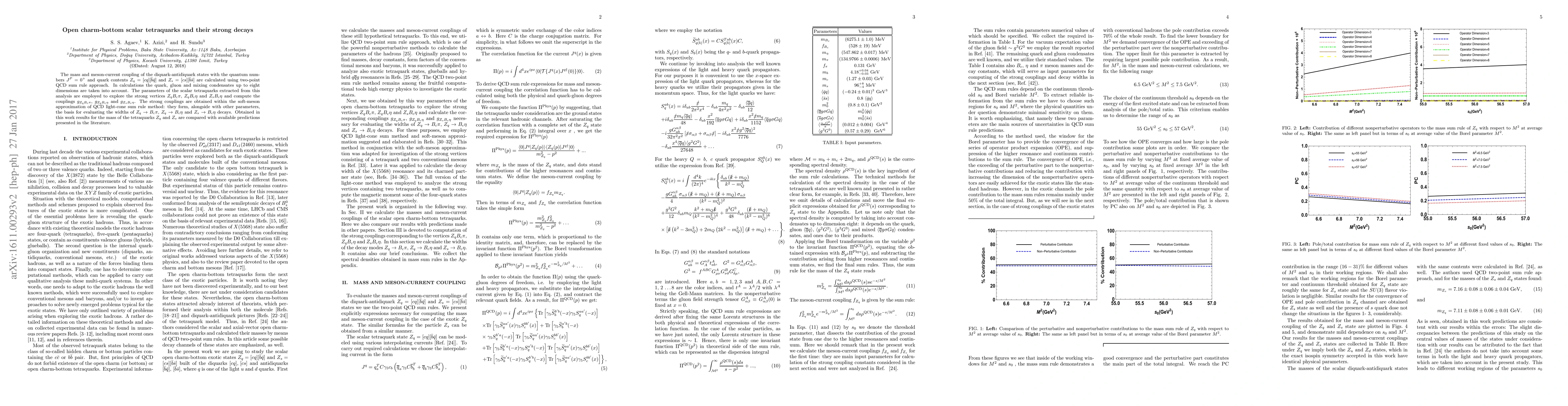 The mass and meson-current coupling of the diquark-antidiquark states with the quantum numbers $J^{P}=0^{+}$ and quark contents $Z_{q}=[cq][\bar {b} \bar q ]$ and $Z_{s}=[cs][\bar {b} \bar s]$ are calculated using two-point QCD sum rule approach. In calculations the quark, gluon and mixing condensates up to eight dimensions are taken into account. The parameters of the scalar tetraquarks extracted from this analysis are employed to explore the strong vertices $Z_q B_c \pi $, $Z_q B_c \eta $ and $Z_s B_c \eta $ and compute the couplings $g_{Z_qB_c \pi }$, $g_{Z_qB_c \eta }$ and $g_{Z_sB_c \eta }$. The strong couplings are obtained within the soft-meson approximation of QCD light-cone sum rule method: they form, alongside with other parameters, the basis for evaluating the widths of $Z_q \to B_c \pi$, $% Z_q \to B_c \eta$ and $Z_s \to B_c \eta$ decays. Obtained in this work results for the mass of the tetraquarks $Z_{q}$ and $Z_{s}$ are compared with available predictions presented in the literature.