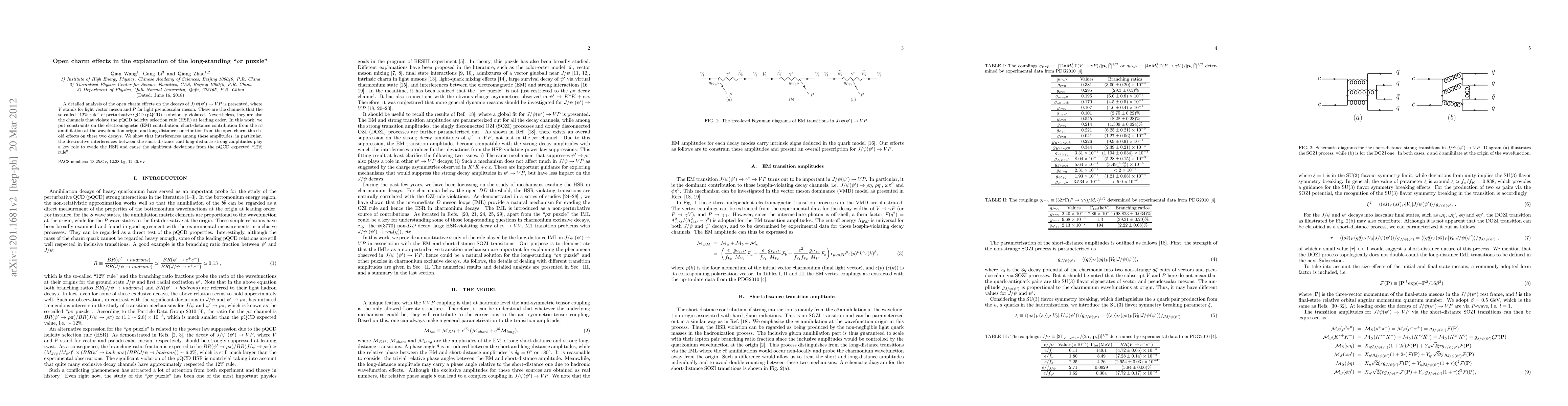 A detailed analysis of the open charm effects on the decays of $J/\psi(\psi^\prime)\to VP$ is presented, where $V$ stands for light vector meson and $P$ for light pseudoscalar meson. These are the channels that the so-called "12% rule" of perturbative QCD (pQCD) is obviously violated. Nevertheless, they are also the channels that violate the pQCD helicity selection rule (HSR) at leading order. In this work, we put constraints on the electromagnetic (EM) contribution, short-distance contribution from the $c\bar{c}$ annihilation at the wavefunction origin, and long-distance contribution from the open charm threshold effects on these two decays. We show that interferences among these amplitudes, in particular, the destructive interferences between the short-distance and long-distance strong amplitudes play a key role to evade the HSR and cause the significant deviations from the pQCD expected "12% rule".