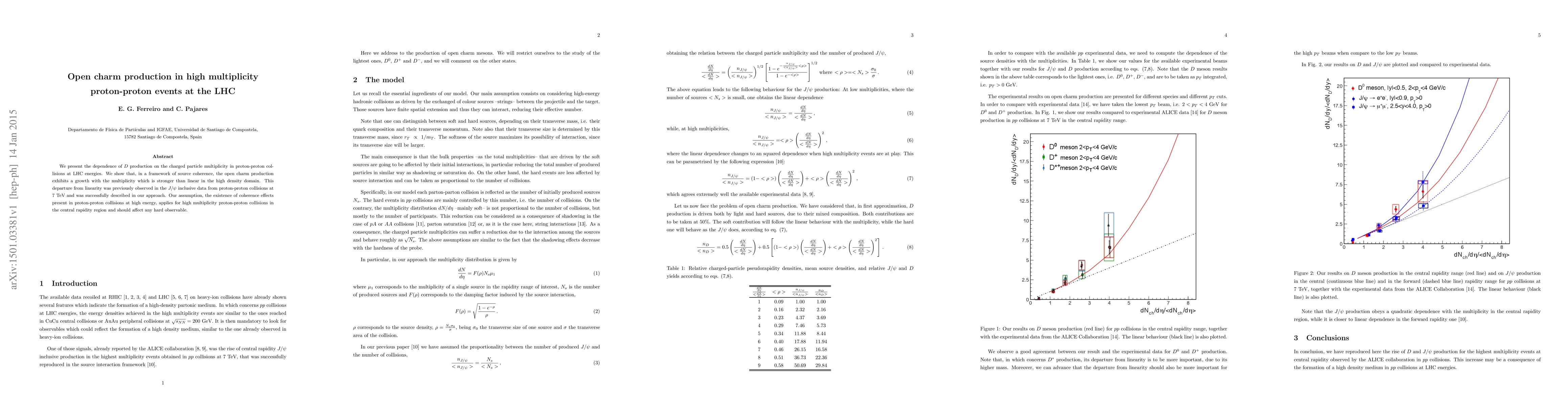 The paper introduces a model that describes open charm production dependence on charged particle multiplicity in proton-proton collisions at the LHC, utilizing the concept of color sources (strings) and their interactions.