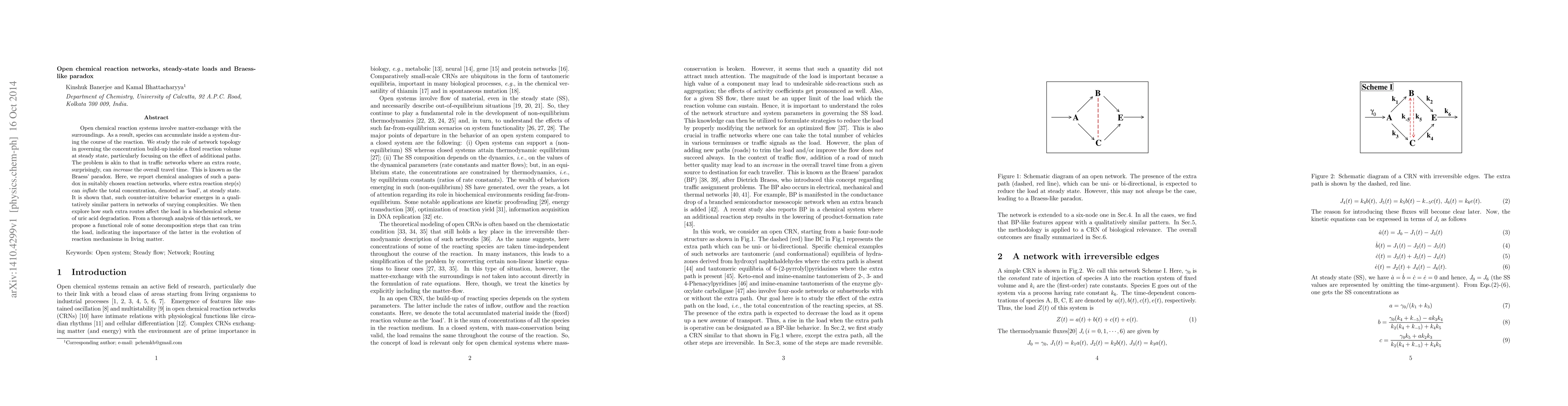 Open chemical reaction systems involve matter-exchange with the surroundings. As a result, species can accumulate inside a system during the course of the reaction. We study the role of network topology in governing the concentration build-up inside a fixed reaction volume at steady state, particularly focusing on the effect of additional paths. The problem is akin to that in traffic networks where an extra route, surprisingly, can increase the overall travel time. This is known as the Braess' paradox. Here, we report chemical analogues of such a paradox in suitably chosen reaction networks, where extra reaction step(s) can inflate the total concentration, denoted as `load', at steady state. It is shown that, such counter-intuitive behavior emerges in a qualitatively similar pattern in networks of varying complexities. We then explore how such extra routes affect the load in a biochemical scheme of uric acid degradation. From a thorough analysis of this network, we propose a functional role of some decomposition steps that can trim the load, indicating the importance of the latter in the evolution of reaction mechanisms in living matter.