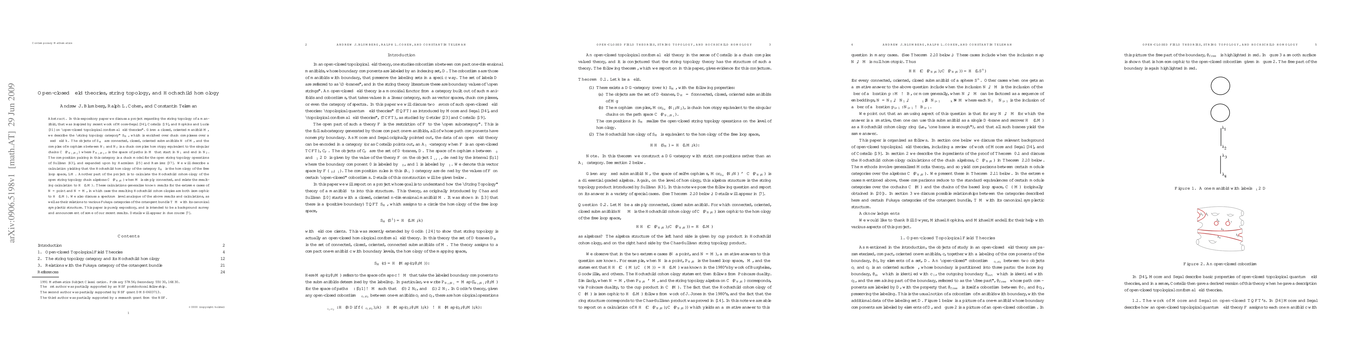 In this expository paper we discuss a project regarding the string topology of a manifold, that was inspired by recent work of Moore-Segal, Costello, and Hopkins and Lurie, on "open-closed topological conformal field theories". Given a closed, oriented manifold M, we describe the "string topology category" S_M, which is enriched over chain complexes over a fixed field k. The objects of S_M are connected, closed, oriented submanifolds N of M, and the complex of morphisms between N_1 and N_2 is a chain complex homotopy equivalent to the singular chains C_*(P_{N_1, N_2}), where C_*(P_{N_1, N_2}) is the space of paths in M that start in N_1 and end in N_2. The composition pairing in this category is a chain model for the open string topology operations of Sullivan and expanded upon by Harrelson, and Ramirez. We will describe a calculation yielding that the Hochschild homology of the category S_M is the homology of the free loop space, LM. Another part of the project is to calculate the Hochschild cohomology of the open string topology chain algebras C_*(P_{N,N}) when M is simply connected, and relate the resulting calculation to H_*(LM). We also discuss a spectrum level analogue of the above results and calculations, as well as their relations to various Fukaya categories of the cotangent bundle T^*M.