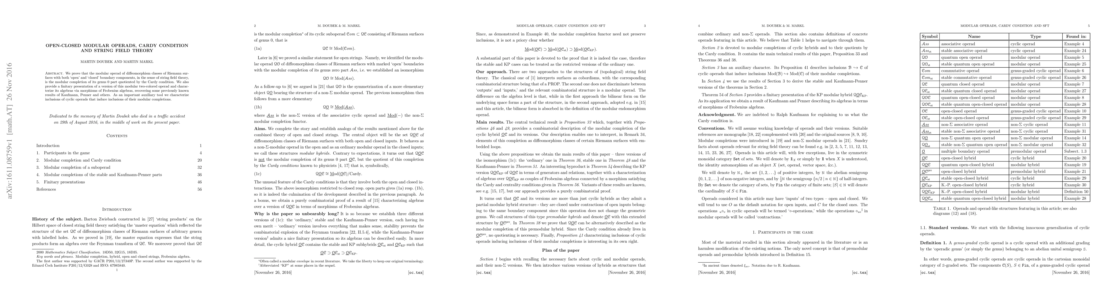 We prove that the modular operad of diffeomorphism classes of Riemann surfaces with both `open' and `closed' boundary components, in the sense of string field theory, is the modular completion of its genus 0 part quotiented by the Cardy condition. We also provide a finitary presentation of a version of this modular two-colored operad and characterize its algebras via morphisms of Frobenius algebras, recovering some previously known results of Kaufmann, Penner and others. As an important auxiliary tool we characterize inclusions of cyclic operads that induce inclusions of their modular completions.