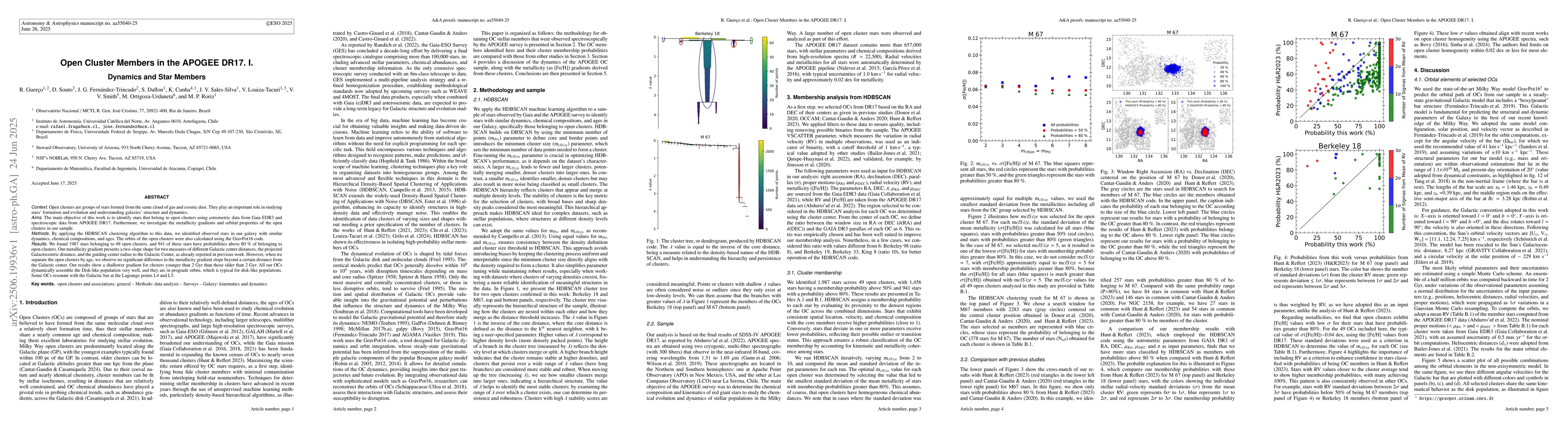 Context. Open clusters are groups of stars formed from the same cloud of gas and cosmic dust. They play an important role in studying stars' formation and evolution and understanding galaxies' structure and dynamics. Aims. The main objective of this work is to identify stars that belong to open clusters using astrometric data from Gaia EDR3 and spectroscopic data from APOGEE DR17. Furthermore, we investigate the metallicity gradients and orbital properties of the open clusters in our sample. Methods. By applying the HDBSCAN clustering algorithm to this data, we identified observed stars in our galaxy with similar dynamics, chemical compositions, and ages. The orbits of the open clusters were also calculated using the GravPot16 code. Results. We found 1987 stars belonging to 49 open clusters, and 941 of these stars have probabilities above 80 % of belonging to open clusters. Our metallicity gradient presents a two-slope shape for two measures of different Galactic center distances, the projected Galactocentric distance, and the guiding center radius to the Galactic Center, as already reported in previous work. However, when we separate the open clusters by age, we observe no significant difference in the metallicity gradient slope beyond a certain distance from the Galactic center. Our results show a shallower gradient for clusters younger than 2 Gyr than those older than 2 Gyr. All our OCs dynamically assemble the Disk-like population very well, and they are in prograde orbits, which is typical for disk-like populations. Some OCs resonate with the Galactic bar at the Lagrange points L4 and L5.