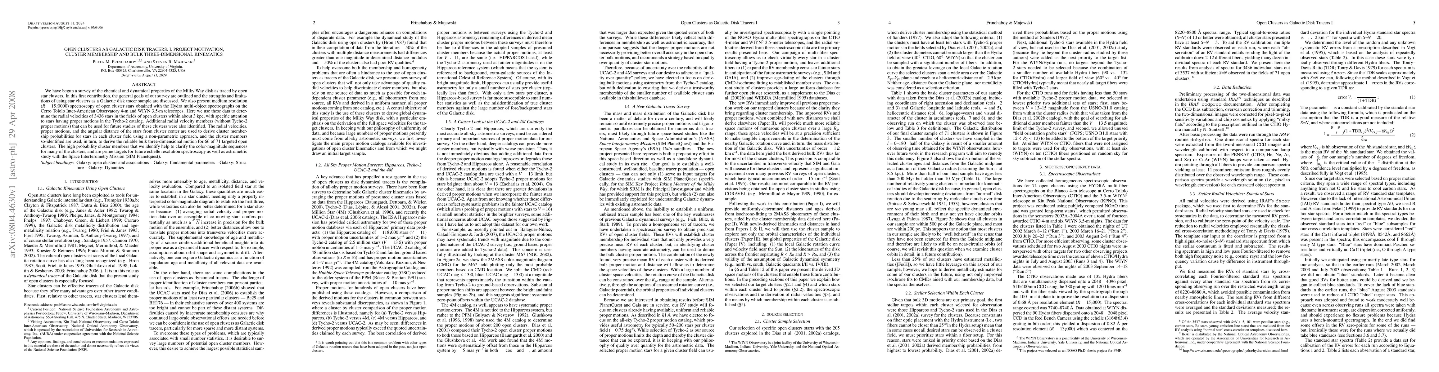 We have begun a survey of the chemical and dynamical properties of the Milky Way disk as traced by open star clusters. In this first contribution, the general goals of our survey are outlined and the strengths and limitations of using star clusters as a Galactic disk tracer sample are discussed. We also present medium resolution (R ~ 15,0000) spectroscopy of open cluster stars obtained with the Hydra multi-object spectrographs on the Cerro Tololo Inter-American Observatory 4-m and WIYN 3.5-m telescopes. Here we use these data to determine the radial velocities of 3436 stars in the fields of open clusters within about 3 kpc, with specific attention to stars having proper motions in the Tycho-2 catalog. Additional radial velocity members (without Tycho-2 proper motions) that can be used for future studies of these clusters were also identified. The radial velocities, proper motions, and the angular distance of the stars from cluster center are used to derive cluster membership probabilities for stars in each cluster field using a non-parametric approach, and the cluster members so-identified are used, in turn, to derive the reliable bulk three-dimensional motion for 66 of 71 targeted open clusters. The high probability cluster members that we identify help to clarify the color-magnitude sequences for many of the clusters, and are prime targets for future echelle resolution spectroscopy as well as astrometric study with the Space Interferometry Mission (SIM Planetquest).