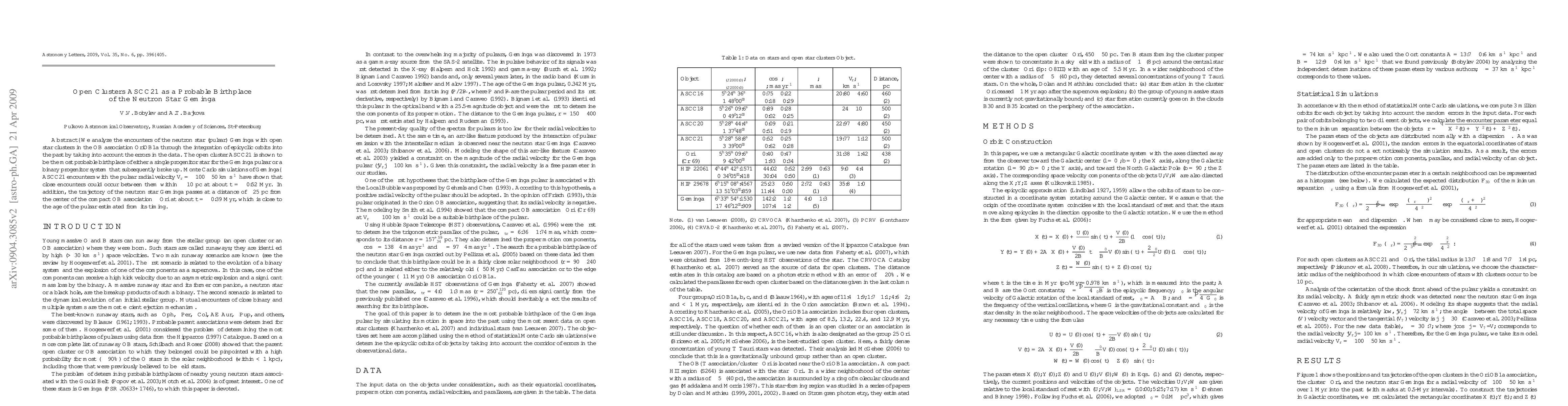 We analyze the encounters of the neutron star (pulsar) Geminga with open star clusters in the OB association OriOB1a through the integration of epicyclic orbits into the past by taking into account the errors in the data. The open cluster ASCC21 is shown to be the most probable birthplace of either a single progenitor star for the Geminga pulsar or a binary progenitor system that subsequently broke up. Monte Carlo simulations of Geminga--ASCC21 encounters with the pulsar radial velocity Vr =-100+-50 km/s have shown that close encounters could occur between them within <= 10 pc at about t=-0.52 Myr. In addition, the trajectory of the neutron star Geminga passes at a distance about 25 pc from the center of the compact OB association lambda Ori at about t=-0.39 Myr, which is close to the age of the pulsar estimated from its timing.