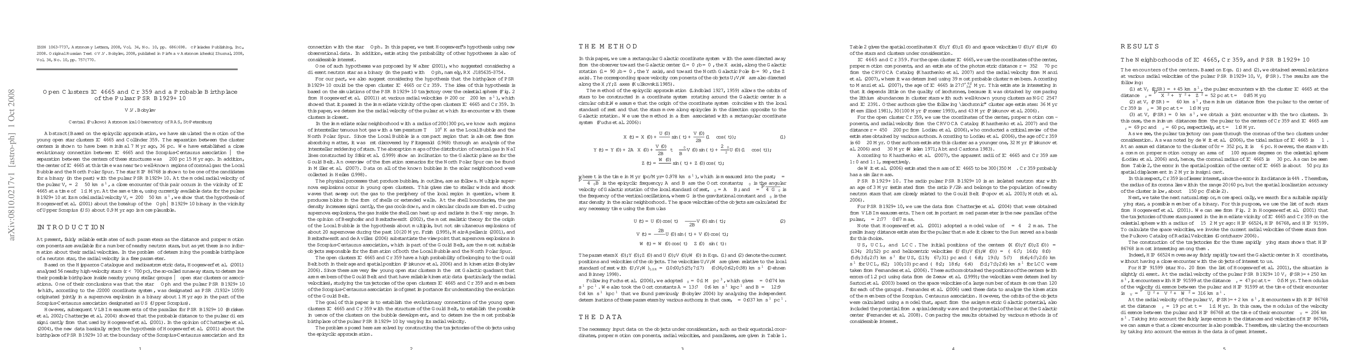 This paper simulates the motion of open clusters IC 4665 and Cr 359 and finds a close evolutionary connection between IC 4665 and the Scorpius-Centaurus association, suggesting a probable birthplace for the pulsar PSR B1929+10 near IC 4665. The star HIP 86768 is identified as a potential former binary companion to the pulsar.