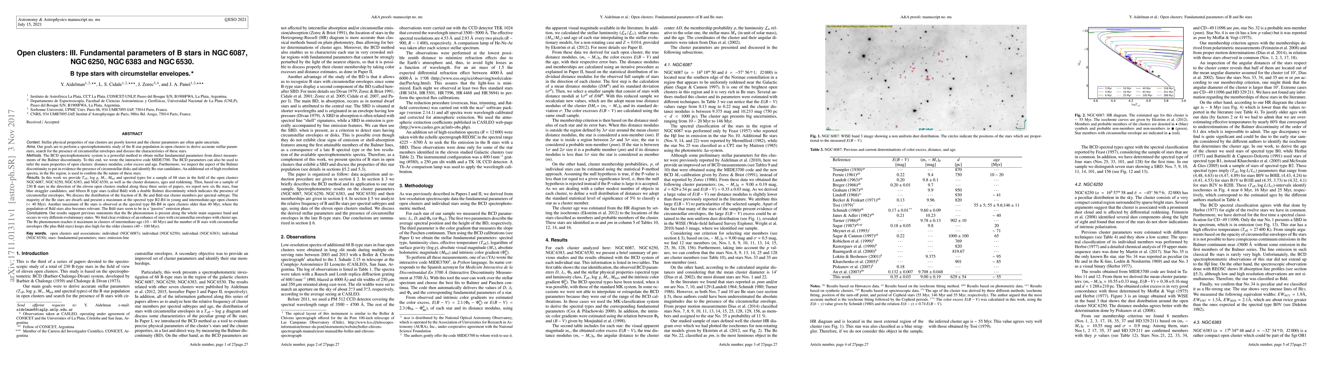 Context. Stellar physical properties of star clusters are poorly known. Aims. Our goals are to perform a spectrophotometric study of the B star population in open clusters to derive accurate stellar parameters, search for the presence of circumstellar envelopes, and discuss the characteristics of these stars. Methods. The BCD spectrophotometric system is a powerful tool to obtain fundamental parameters and infer the main properties of open clusters: distance modulus, color excess, and age. We inspected the Balmer discontinuity to seek circumstellar disks and identify Be-star candidates. High resolution spectra in the H$\alpha$ region are used to confirm the Be nature. Results. We provide Teff , log g, Mv , Mbol and spectral types for a sample of 68 stars in the field of the open clusters NGC 6087, NGC 6250, NGC 6383, and NGC 6530, as well as the cluster distances, ages and reddening. Then, based on a sample of 230 B stars in the direction of the 11 open clusters studied along this series of three papers, we report 6 new Be stars, 4 blue straggler candidates, and 15 B-type stars (called Bdd) with a double Balmer discontinuity. We also find that the majority of the Be stars are dwarfs and present a maximum at the spectral type B2-B4 in young and intermediate-age open clusters. Another maximum of Be stars is observed at the spectral type B6-B8 in open clusters older than 40 Myr, where the population of Bdd stars also becomes relevant. Conclusions. Our results support previous statements that the Be phenomenon is present along the whole main sequence band and occurs in very different evolutionary states. We find clear evidence of an increase of stars with circumstellar envelopes with cluster age. The Be phenomenon reaches its maximum in clusters of intermediate age and the number of B stars with circumstellar envelopes (Be+Bdd stars) is also high for the older clusters.