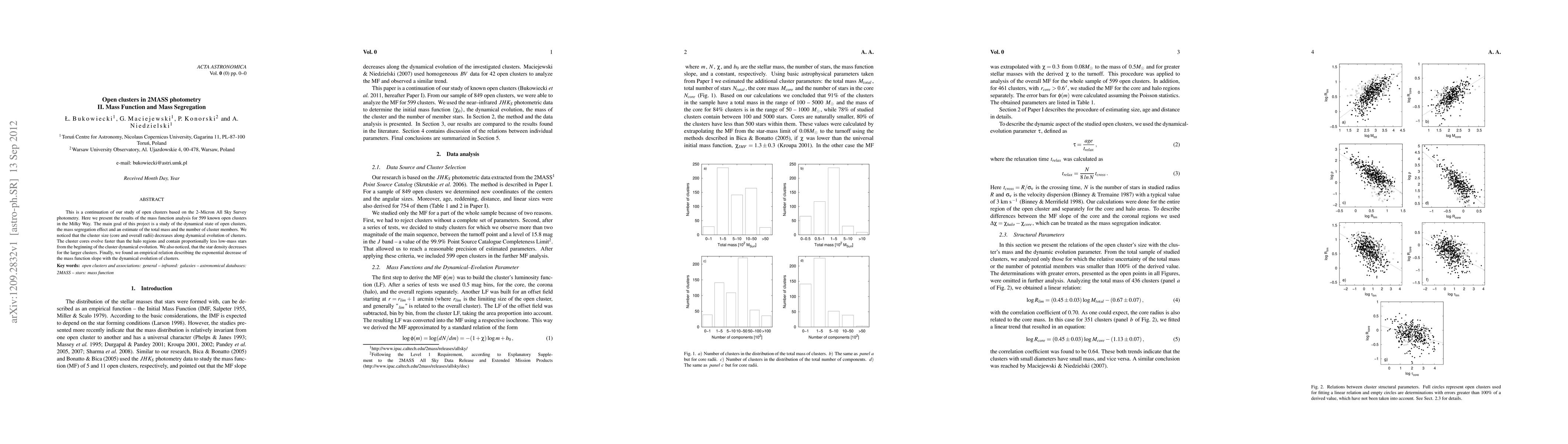 This study analyzes the mass function and mass segregation in 599 Milky Way open clusters using 2MASS photometry, revealing that cluster cores evolve faster and contain fewer low-mass stars, while larger clusters exhibit decreasing star density, with an empirical relation describing the mass function slope's exponential decline over time.