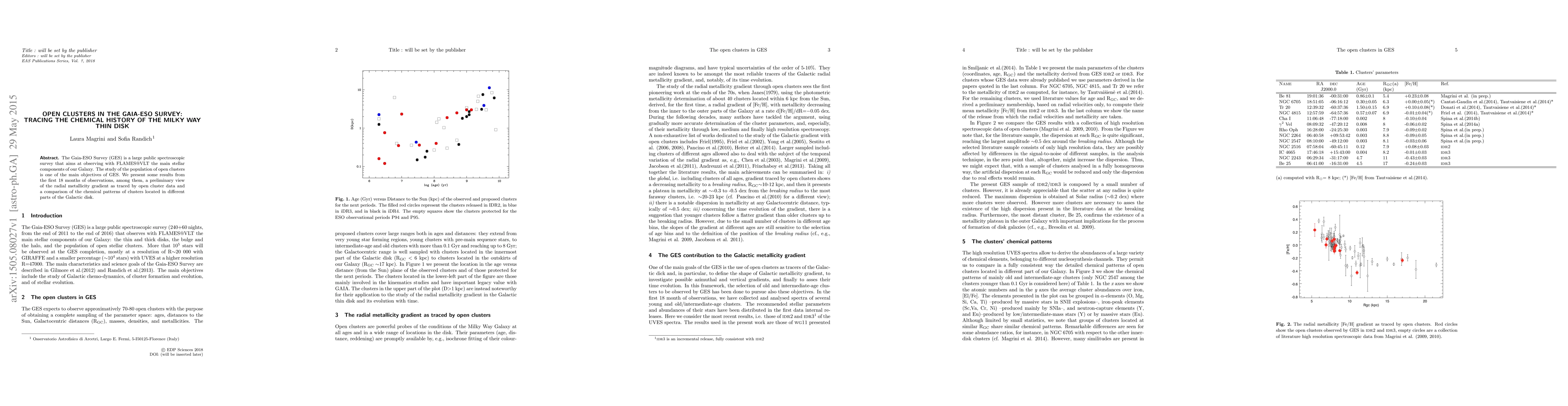 The Gaia-ESO Survey aims to observe the Milky Way's stellar components, focusing on open clusters to trace the galaxy's chemical history. Preliminary results show a radial metallicity gradient and differing chemical patterns in clusters across the Galactic disk.