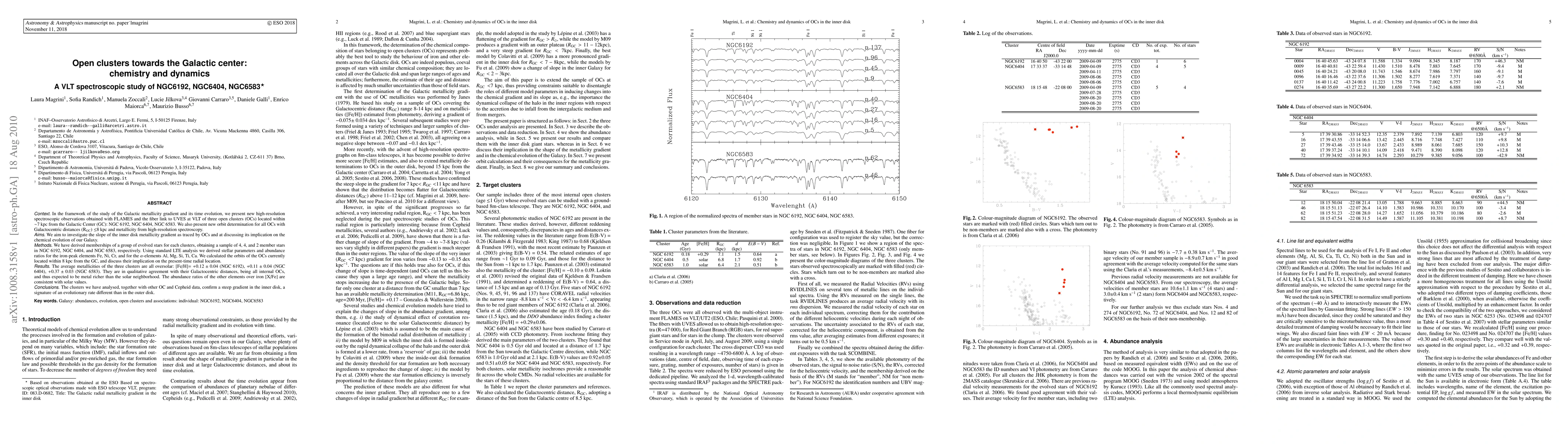 In the framework of the study of the Galactic metallicity gradient and its time evolution, we present new high-resolution spectroscopic observations obtained with FLAMES and the fiber link to UVES at VLT of three open clusters (OCs) located within $\sim$7~kpc from the Galactic Center (GC): NGC~6192, NGC~6404, NGC~6583. We also present new orbit determination for all OCs with Galactocentric distances (R$_{\rm{GC}}) \leq$8~kpc and metallicity from high-resolution spectroscopy. We aim to investigate the slope of the inner disk metallicity gradient as traced by OCs and at discussing its implication on the chemical evolution of our Galaxy. We have derived memberships of a group of evolved stars for each clusters, obtaining a sample of 4, 4, and 2 member stars in NGC~6192, NGC~6404, and NGC~6583, respectively. Using standard LTE analysis we derived stellar parameters and abundance ratios for the iron-peak elements Fe, Ni, Cr, and for the $\alpha$-elements Al, Mg, Si, Ti, Ca. We calculated the orbits of the OCs currently located within 8~kpc from the GC, and discuss their implication on the present-time radial location. {The average metallicities of the three clusters are all oversolar: [Fe/H]= $+0.12\pm0.04$ (NGC~6192), $+0.11\pm0.04$ (NGC 6404), $+0.37\pm0.03$ (NGC 6583). They are in qualitative agreement with their Galactocentric distances, being all internal OCs, and thus expected to be metal richer than the solar neighborhood. The abundance ratios of the other elements over iron [X/Fe] are consistent with solar values. The clusters we have analysed, together with other OC and Cepheid data, confirm a steep gradient in the inner disk, a signature of an evolutionary rate different than in the outer disk.