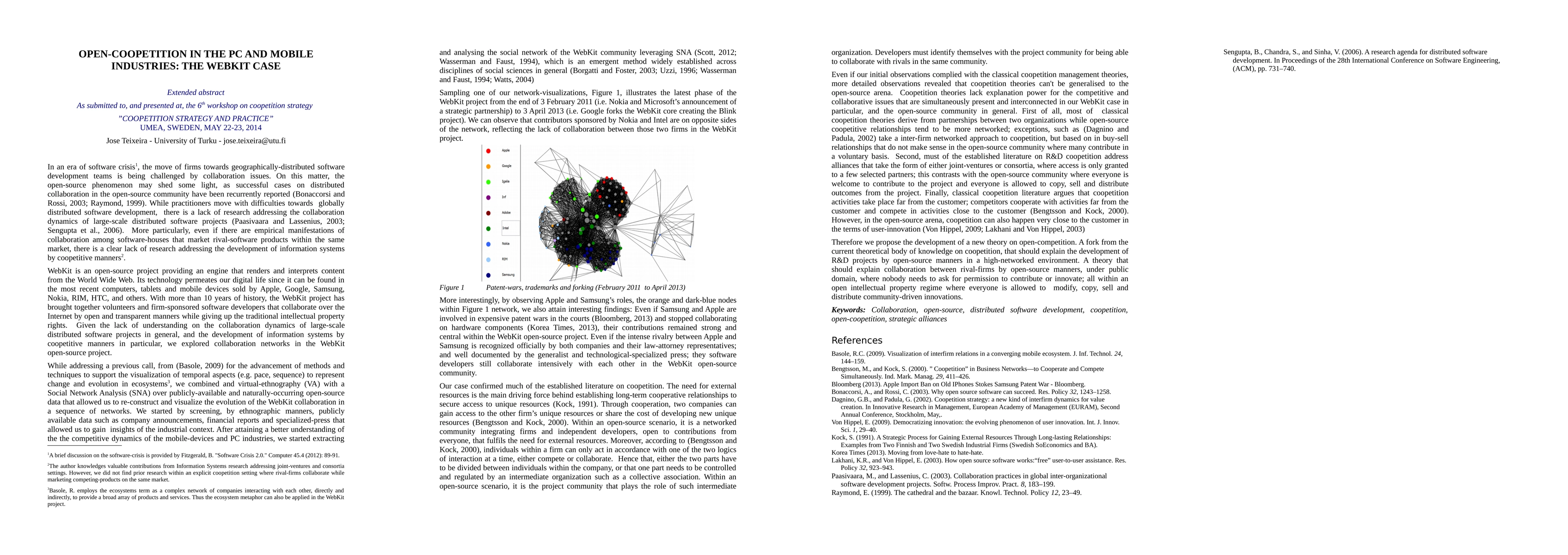 This paper examines the open-coopetition dynamics in the PC and mobile industries through the WebKit case, utilizing virtual-ethnography and Social Network Analysis to visualize the evolution of WebKit's collaboration. It finds that while coopetition theory largely holds, not all theoretical propositions apply to the open-source context.