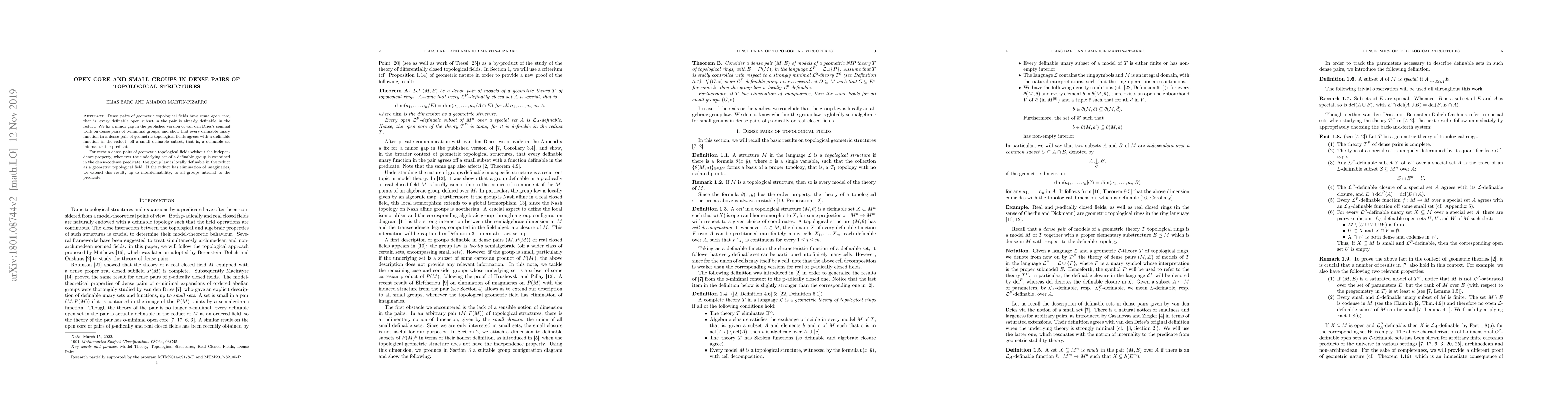 Dense pairs of geometric topological fields have tame open core, that is, every definable open subset in the pair is already definable in the reduct. We fix a minor gap in the published version of van den Dries's seminal work on dense pairs of o-minimal groups, and show that every definable unary function in a dense pair of geometric topological fields agrees with a definable function in the reduct, off a small definable subset, that is, a definable set internal to the predicate. For certain dense pairs of geometric topological fields without the independence property, whenever the underlying set of a definable group is contained in the dense-codense predicate, the group law is locally definable in the reduct as a geometric topological field. If the reduct has elimination of imaginaries, we extend this result, up to interdefinability, to all groups internal to the predicate.