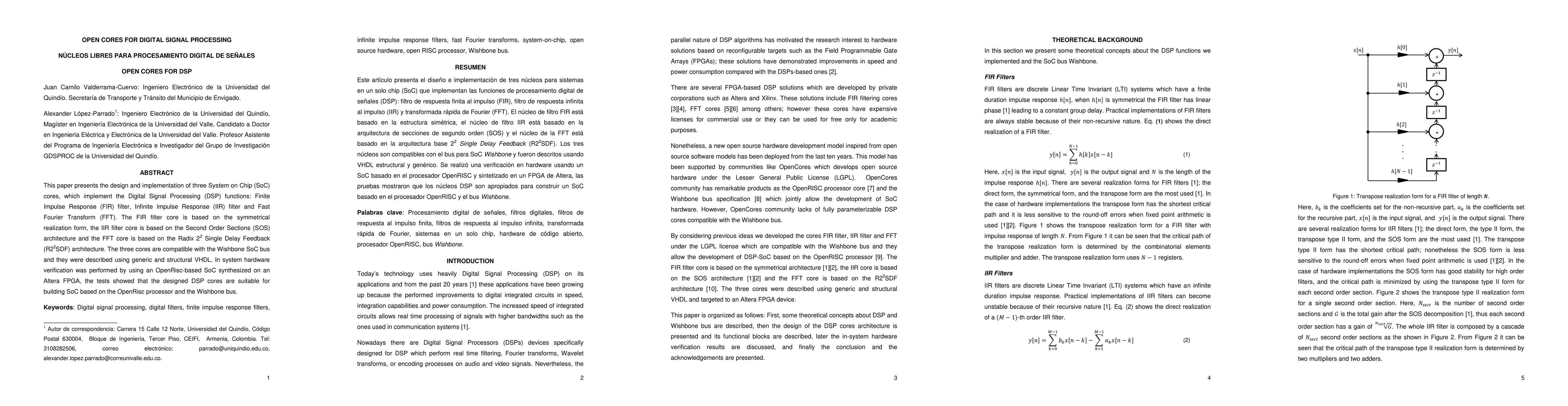 This paper designs and implements three SoC cores for DSP functions: FIR, IIR, and FFT, using VHDL. The cores are verified on an OpenRisc-based SoC FPGA, demonstrating compatibility with the Wishbone bus.