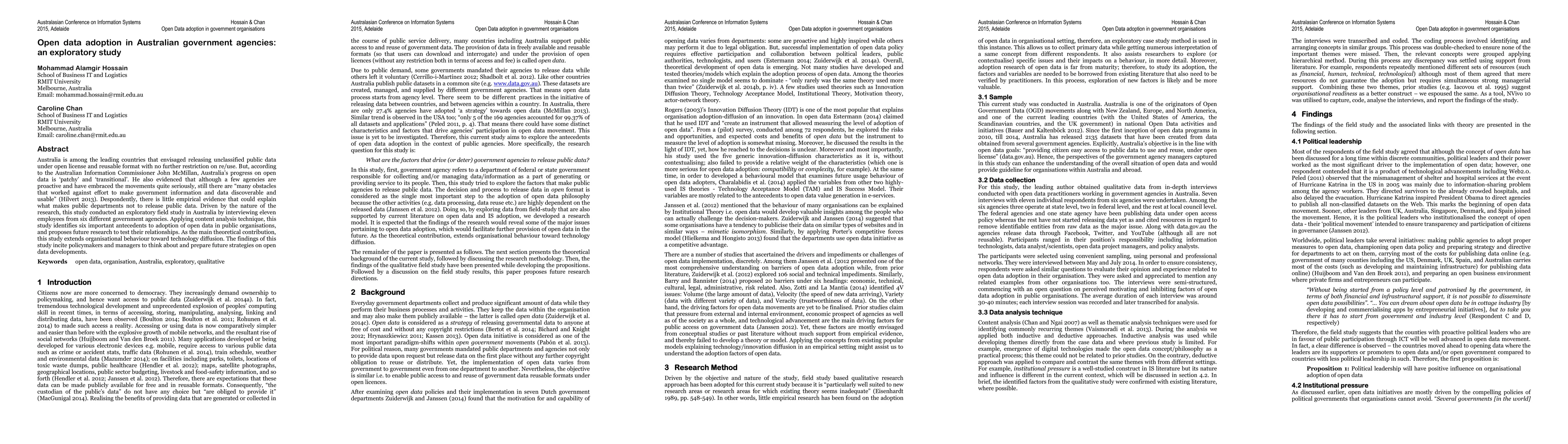 This study explores the adoption of open data in Australian government agencies, revealing six key antecedents through interviews with eleven employees from six agencies. The research highlights the need for future empirical studies to test these factors and extend organisational behaviour theory on technology diffusion.