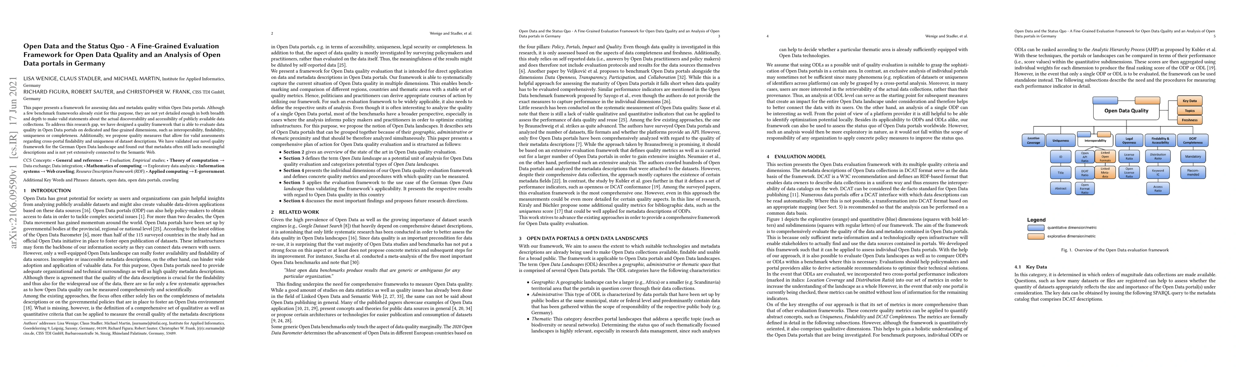 This paper introduces a detailed evaluation framework for assessing data quality in Open Data portals, focusing on dimensions like interoperability and findability. The framework was validated in Germany, revealing that metadata often lacks meaningful descriptions and is insufficiently integrated with the Semantic Web.