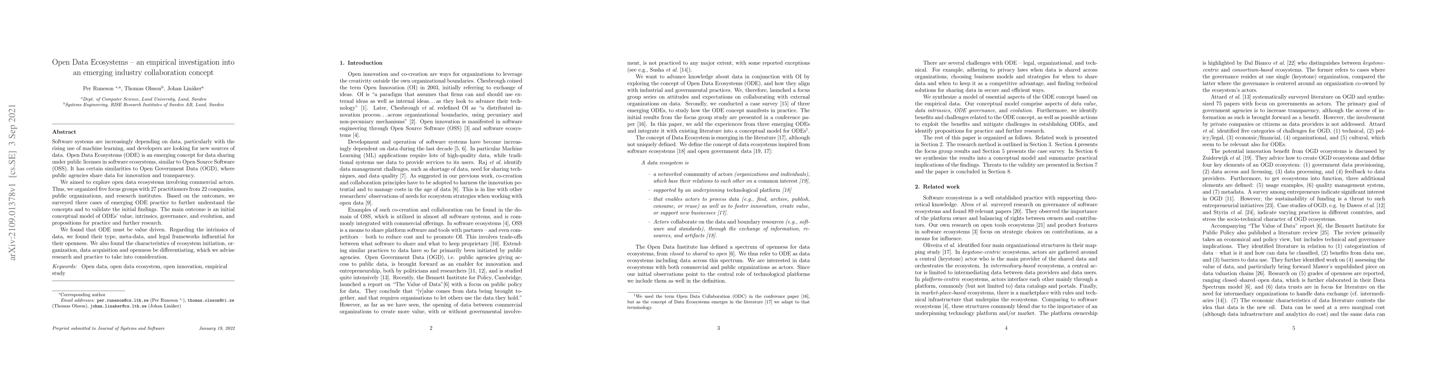 Software systems are increasingly depending on data, particularly with the rising use of machine learning, and developers are looking for new sources of data. Open Data Ecosystems (ODE) is an emerging concept for data sharing under public licenses in software ecosystems, similar to Open Source Software (OSS). It has certain similarities to Open Government Data (OGD), where public agencies share data for innovation and transparency. We aimed to explore open data ecosystems involving commercial actors. Thus, we organized five focus groups with 27 practitioners from 22 companies, public organizations, and research institutes. Based on the outcomes, we surveyed three cases of emerging ODE practice to further understand the concepts and to validate the initial findings. The main outcome is an initial conceptual model of ODEs' value, intrinsics, governance, and evolution, and propositions for practice and further research. We found that ODE must be value driven. Regarding the intrinsics of data, we found their type, meta-data, and legal frameworks influential for their openness. We also found the characteristics of ecosystem initiation, organization, data acquisition and openness be differentiating, which we advise research and practice to take into consideration.