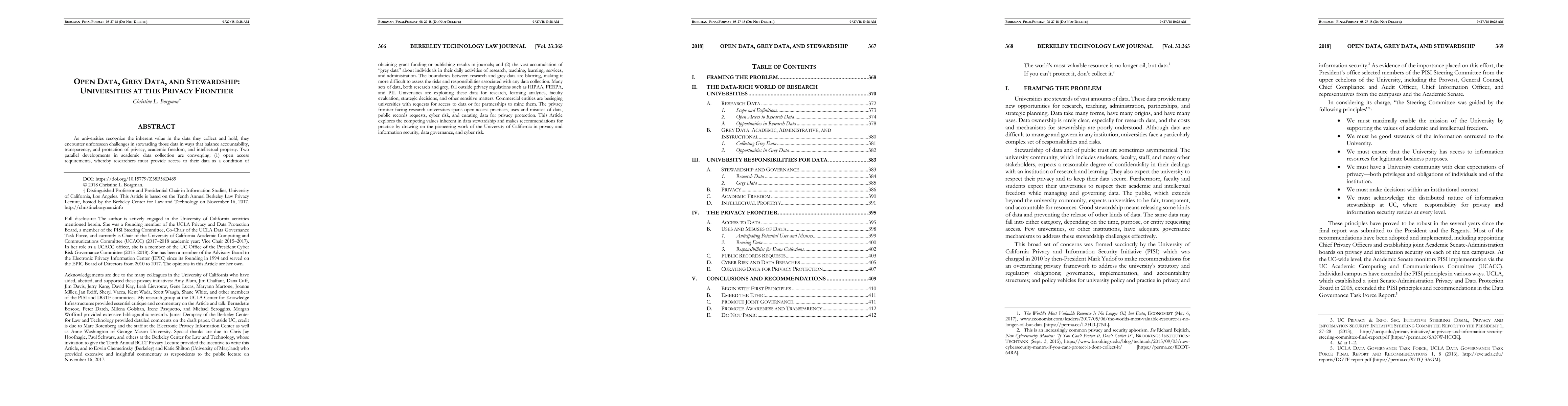 This paper examines the challenges universities face in managing the data they collect, balancing open access requirements with privacy protection, and navigating the complexities of 'grey data' that fall outside traditional privacy regulations. It highlights the University of California's pioneering efforts in data stewardship and recommends best practices for handling data responsibly.