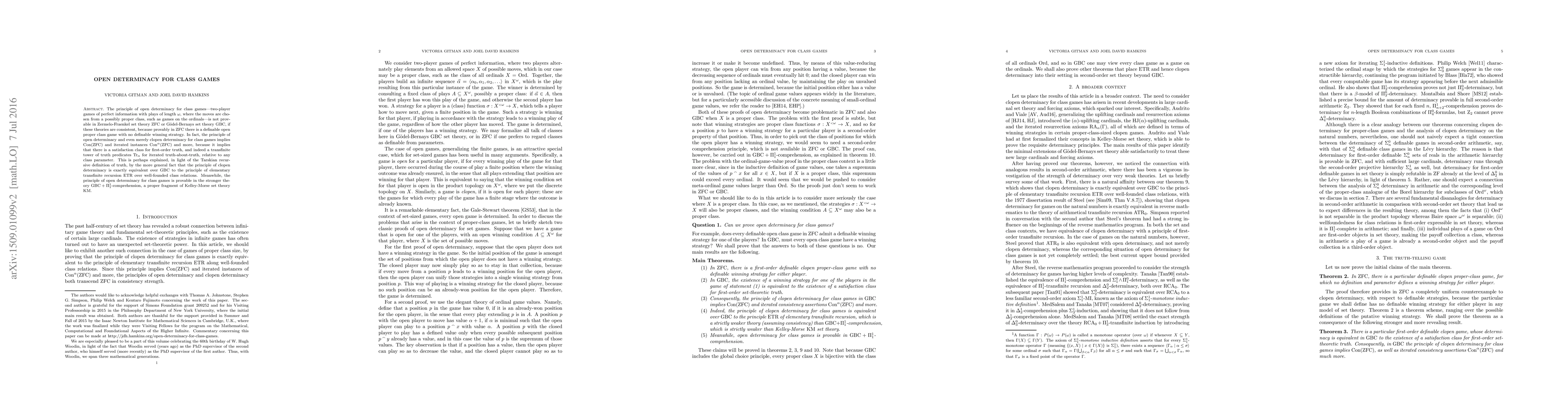 This paper explores the principle of open determinacy for class games, showing it is unprovable in ZFC or GBC set theories but implies significant consistency strengths such as Con(ZFC) and beyond. It is provable in GBC+Π¹₁-comprehension.