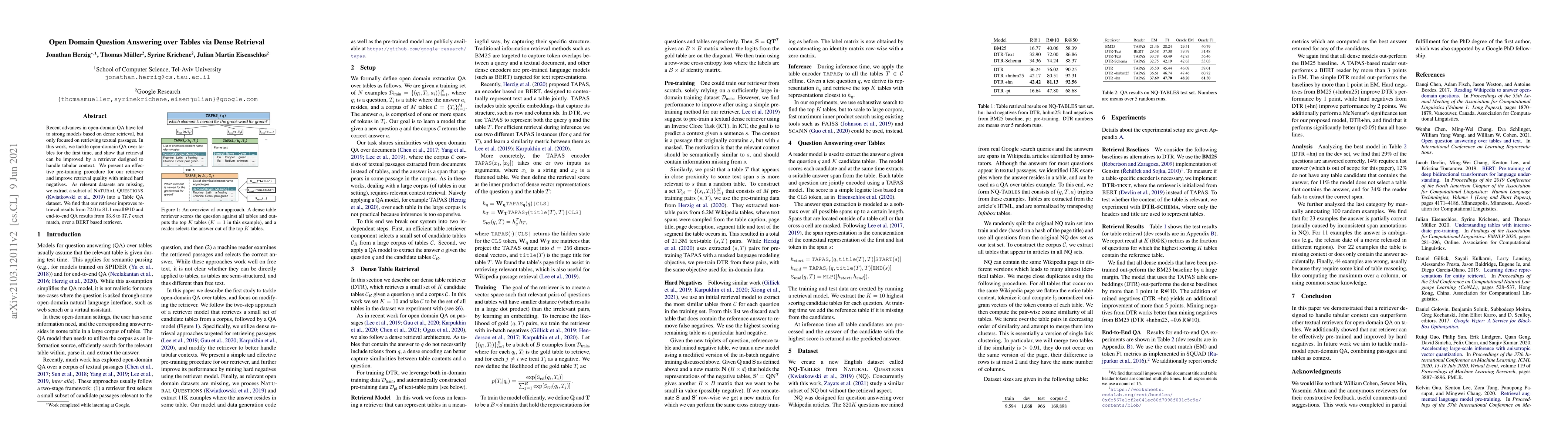 This research introduces the first open-domain Question Answering (QA) system over tables using dense retrieval. It presents a pre-training procedure for a table-specific retriever and improves retrieval quality with mined hard negatives. The authors created a Table QA dataset from Natural Questions, showing that their retriever enhances recall@10 from 72.0 to 81.1 and exact match in end-to-end QA from 33.8 to 37.7, outperforming a BERT-based retriever.