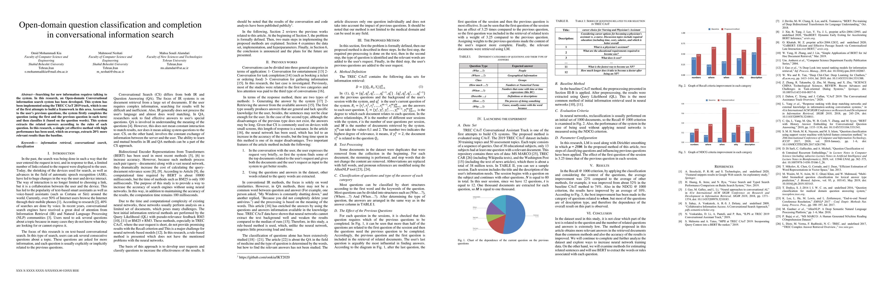 Researchers developed an open-domain conversational information search system that effectively completes and classifies questions, extracting 20% more relevant results than a baseline method.