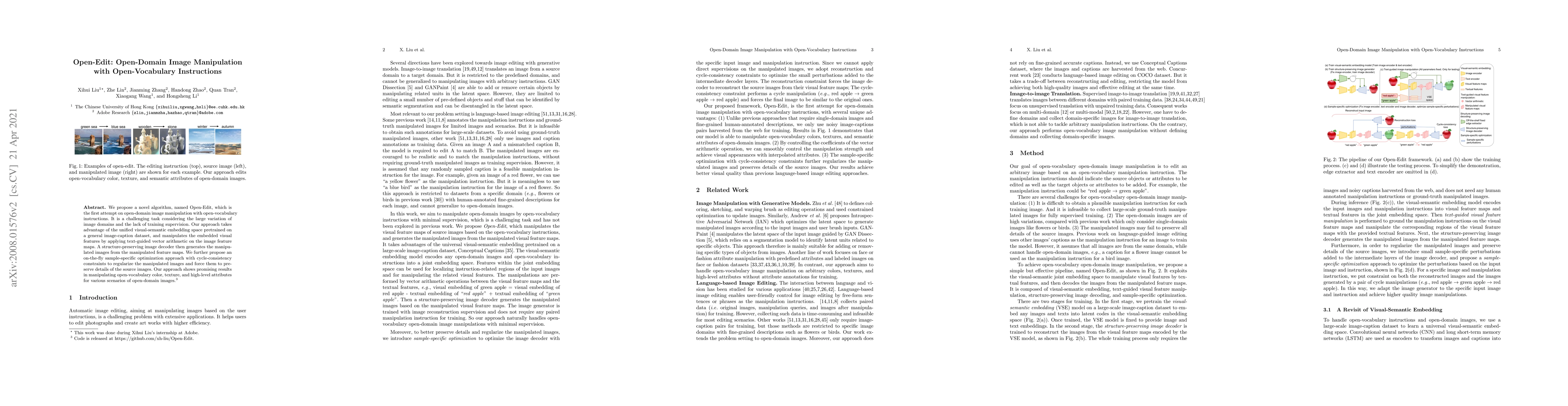 Open-Edit introduces a novel algorithm for open-domain image manipulation using open-vocabulary instructions, leveraging a pretrained visual-semantic embedding space and text-guided vector arithmetic to manipulate image features. An on-the-fly optimization approach with cycle-consistency constraints ensures the preservation of image details.