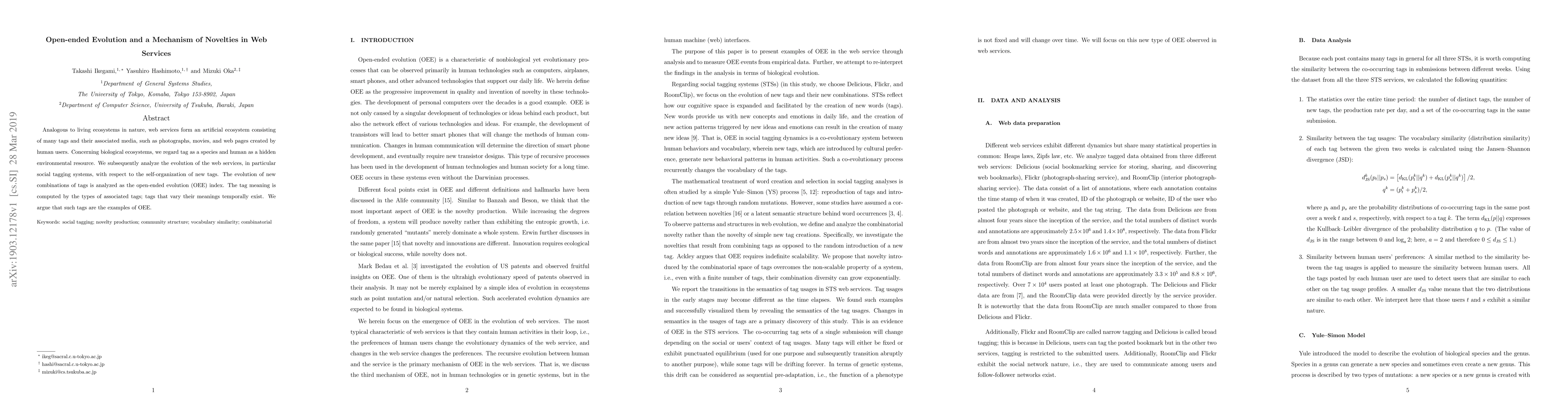 Analogous to living ecosystems in nature, web services form an artificial ecosystem consisting of many tags and their associated media, such as photographs, movies, and web pages created by human users. Concerning biological ecosystems, we regard tag as a species and human as a hidden environmental resource. We subsequently analyze the evolution of the web services, in particular social tagging systems, with respect to the self-organization of new tags. The evolution of new combinations of tags is analyzed as the open-ended evolution (OEE) index. The tag meaning is computed by the types of associated tags; tags that vary their meanings temporally exist. We argue that such tags are the examples of OEE.