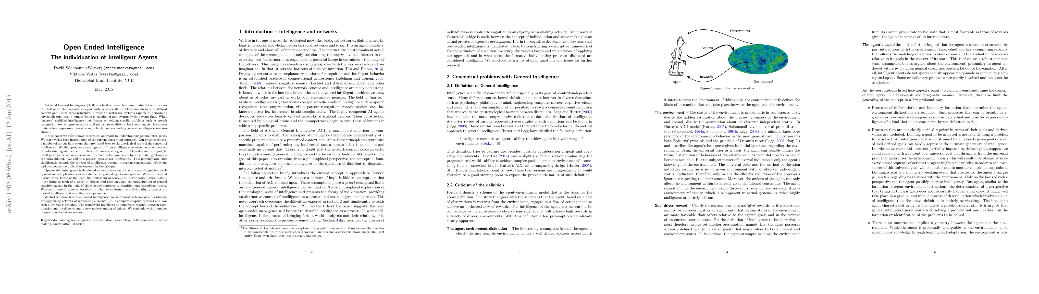 Artificial General Intelligence is a field of research aiming to distill the principles of intelligence that operate independently of a specific problem domain or a predefined context and utilize these principles in order to synthesize systems capable of performing any intellectual task a human being is capable of and eventually go beyond that. While "narrow" artificial intelligence which focuses on solving specific problems such as speech recognition, text comprehension, visual pattern recognition, robotic motion, etc. has shown quite a few impressive breakthroughs lately, understanding general intelligence remains elusive. In the paper we offer a novel theoretical approach to understanding general intelligence. We start with a brief introduction of the current conceptual approach. Our critique exposes a number of serious limitations that are traced back to the ontological roots of the concept of intelligence. We then propose a paradigm shift from intelligence perceived as a competence of individual agents defined in relation to an a priori given problem domain or a goal, to intelligence perceived as a formative process of self-organization by which intelligent agents are individuated. We call this process open-ended intelligence. Open-ended intelligence is developed as an abstraction of the process of cognitive development so its application can be extended to general agents and systems. We introduce and discuss three facets of the idea: the philosophical concept of individuation, sense-making and the individuation of general cognitive agents. We further show how open-ended intelligence can be framed in terms of a distributed, self-organizing network of interacting elements and how such process is scalable. The framework highlights an important relation between coordination and intelligence and a new understanding of values. We conclude with a number of questions for future research.