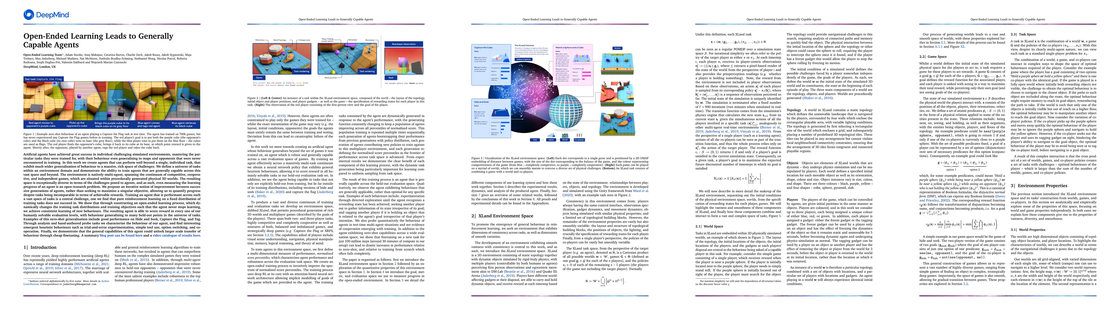 In this work we create agents that can perform well beyond a single, individual task, that exhibit much wider generalisation of behaviour to a massive, rich space of challenges. We define a universe of tasks within an environment domain and demonstrate the ability to train agents that are generally capable across this vast space and beyond. The environment is natively multi-agent, spanning the continuum of competitive, cooperative, and independent games, which are situated within procedurally generated physical 3D worlds. The resulting space is exceptionally diverse in terms of the challenges posed to agents, and as such, even measuring the learning progress of an agent is an open research problem. We propose an iterative notion of improvement between successive generations of agents, rather than seeking to maximise a singular objective, allowing us to quantify progress despite tasks being incomparable in terms of achievable rewards. We show that through constructing an open-ended learning process, which dynamically changes the training task distributions and training objectives such that the agent never stops learning, we achieve consistent learning of new behaviours. The resulting agent is able to score reward in every one of our humanly solvable evaluation levels, with behaviour generalising to many held-out points in the universe of tasks. Examples of this zero-shot generalisation include good performance on Hide and Seek, Capture the Flag, and Tag. Through analysis and hand-authored probe tasks we characterise the behaviour of our agent, and find interesting emergent heuristic behaviours such as trial-and-error experimentation, simple tool use, option switching, and cooperation. Finally, we demonstrate that the general capabilities of this agent could unlock larger scale transfer of behaviour through cheap finetuning.