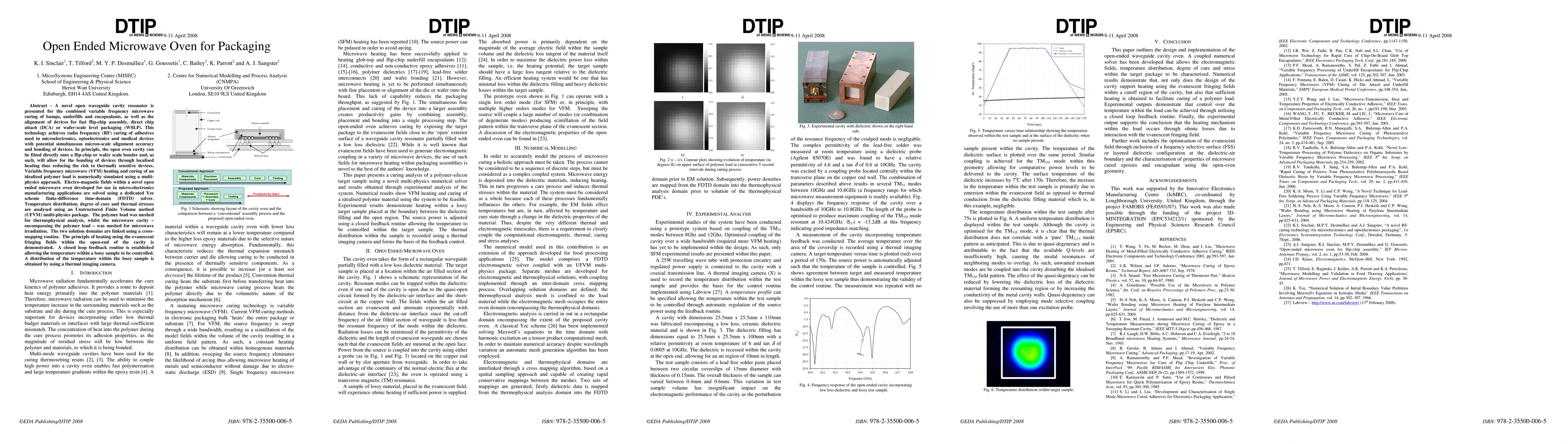 A novel open waveguide cavity resonator is presented for the combined variable frequency microwave curing of bumps, underfills and encapsulants, as well as the alignment of devices for fast flip-chip assembly, direct chip attach (DCA) or wafer-scale level packaging (WSLP). This technology achieves radio frequency (RF) curing of adhesives used in microelectronics, optoelectronics and medical devices with potential simultaneous micron-scale alignment accuracy and bonding of devices. In principle, the open oven cavity can be fitted directly onto a flip-chip or wafer scale bonder and, as such, will allow for the bonding of devices through localised heating thus reducing the risk to thermally sensitive devices. Variable frequency microwave (VFM) heating and curing of an idealised polymer load is numerically simulated using a multi-physics approach. Electro-magnetic fields within a novel open ended microwave oven developed for use in micro-electronics manufacturing applications are solved using a de icated Yee scheme finite-difference time-domain (FDTD) solver. Temperature distribution, degree of cure and thermal stresses are analysed using an Unstructured Finite Volume method (UFVM) multi-physics package. The polymer load was meshed for thermophysical analysis, whilst the microwave cavity - encompassing the polymer load - was meshed for microwave irradiation. The two solution domains are linked using a cross-mapping routine. The principle of heating using the evanescent fringing fields within the open-end of the cavity is demonstrated. A closed loop feedback routine is established allowing the temperature within a lossy sample to be controlled. A distribution of the temperature within the lossy sample is obtained by using a thermal imaging camera.